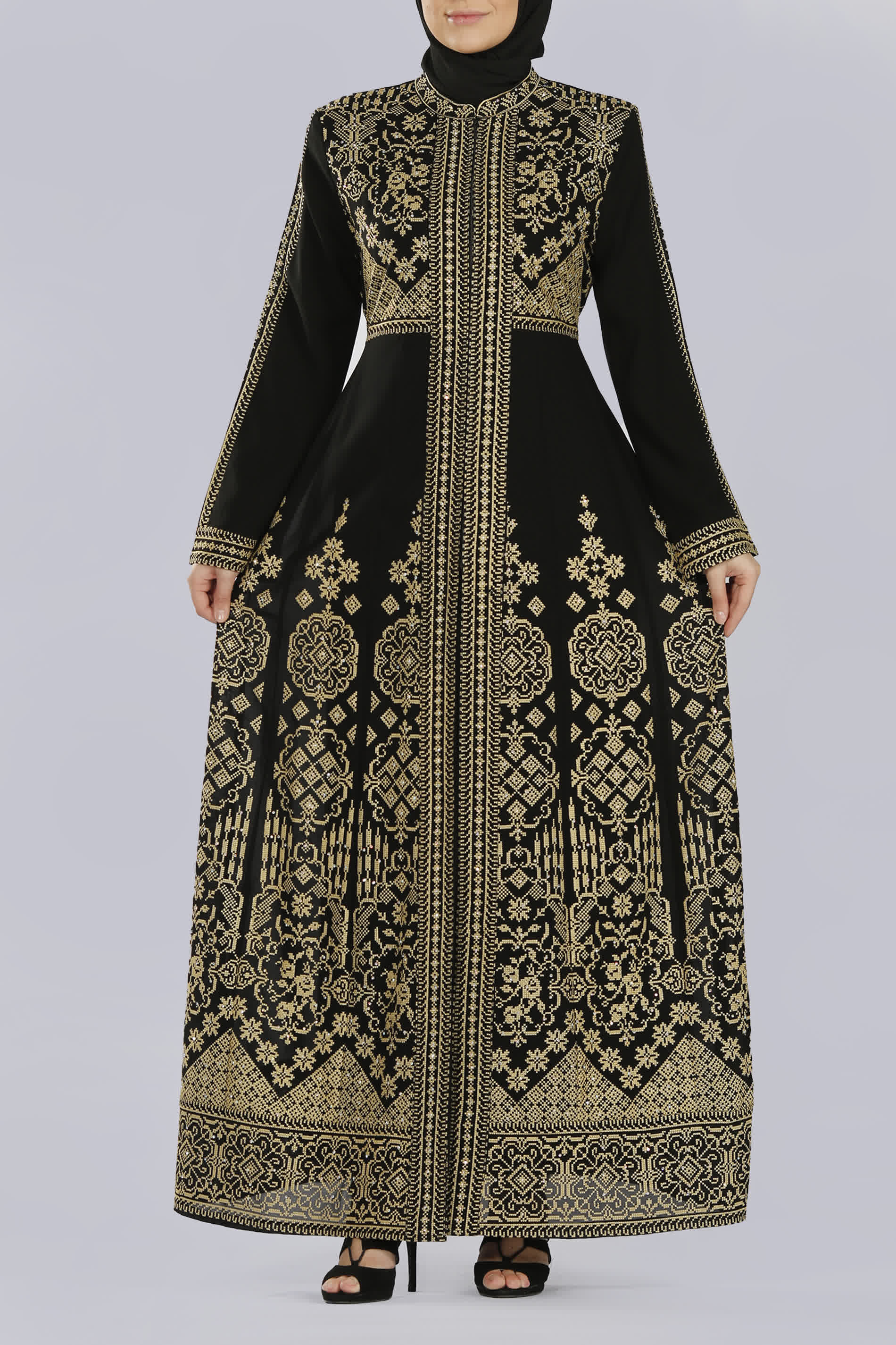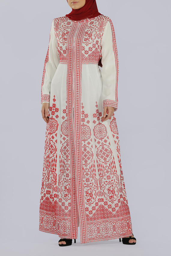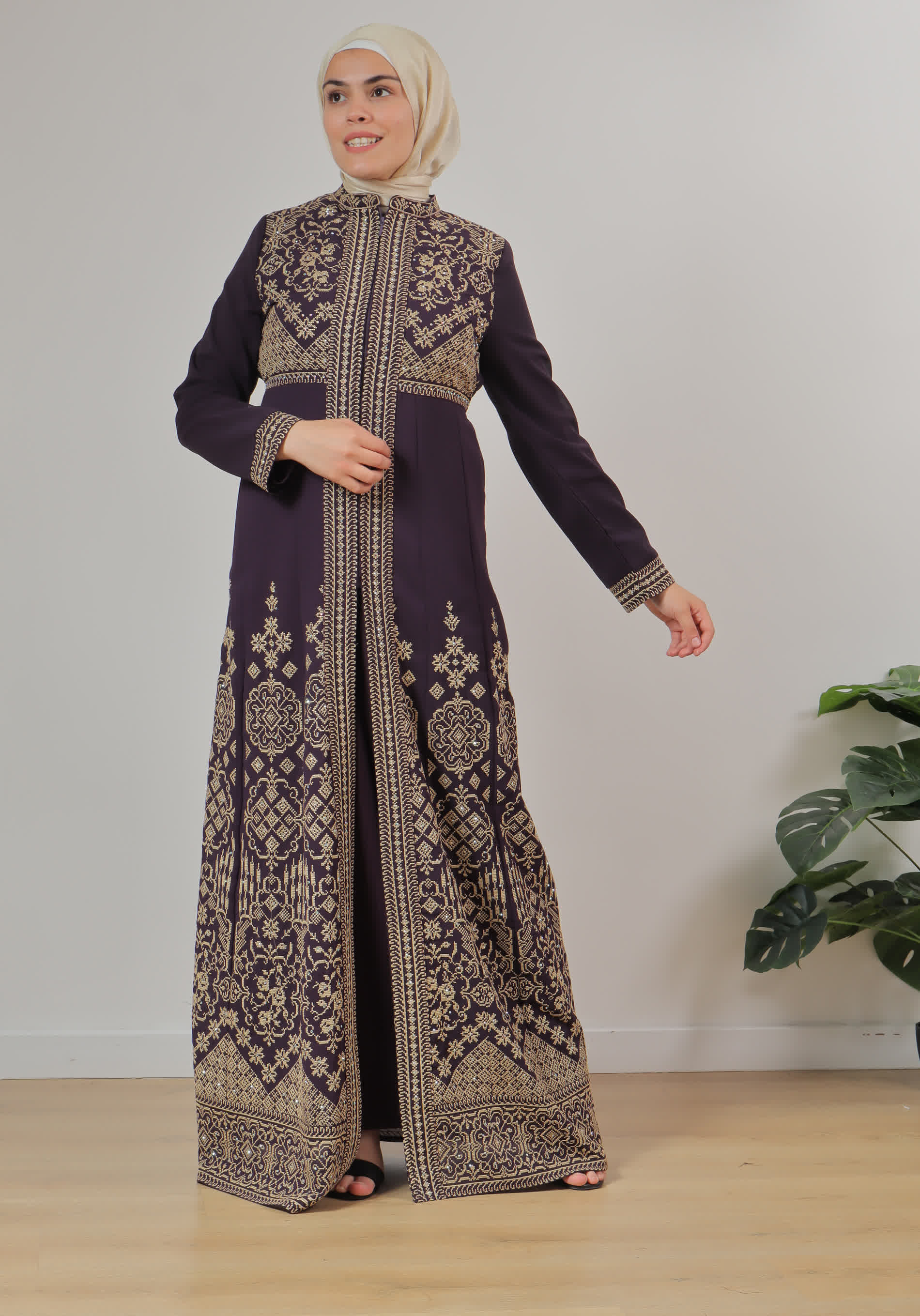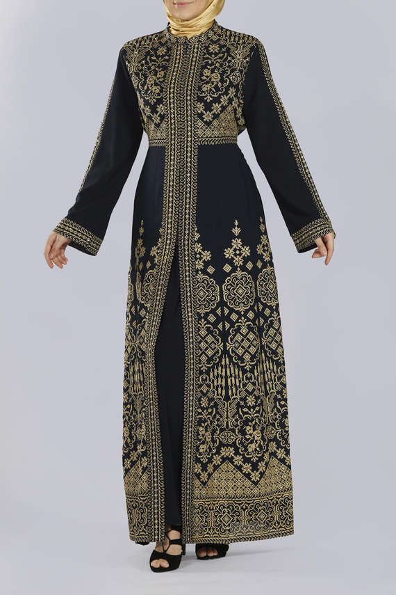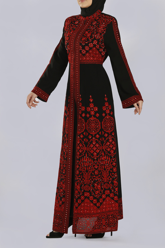 مكون من قطعتين القطعة الأولى مطرزة بالتطريز الفلاحي وبالغرزة الفرنسية، ومرصع بالستراس الذي يزيده بهجة وفخامة، مع سحاب أمامي يصل للمنتصف ومفتوح من الأسفل، وحزام متصل يمكن ربطه من الخلف.