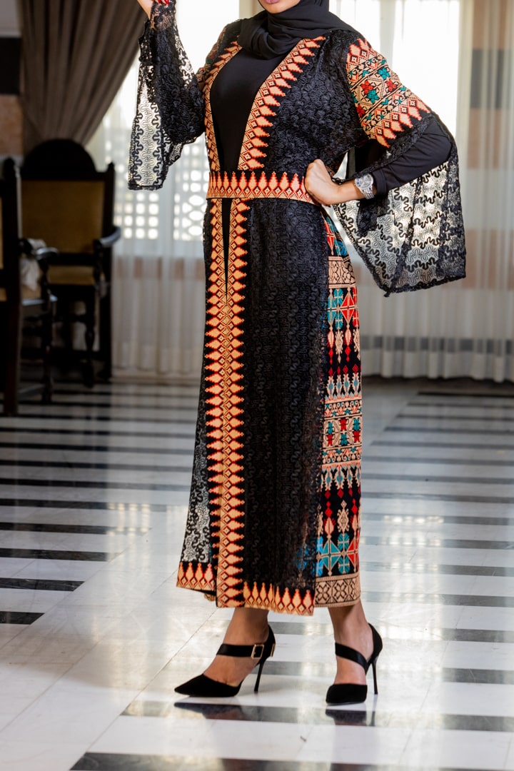 عباية مفتوحة مطرزة بأفخم نقشات التطريز الفلسطيني بألوان براقة وجميلة تضفي طابعاً خاصاً للعباية، مرصعة بالستراس اللامع مع حزام مطرز منفصل