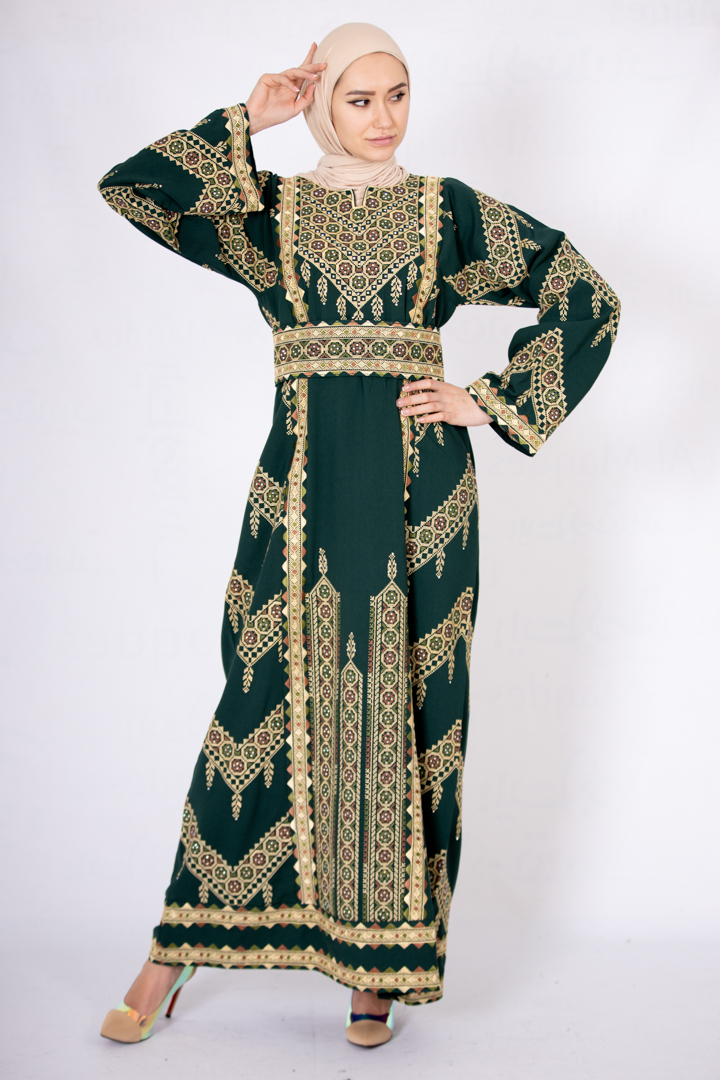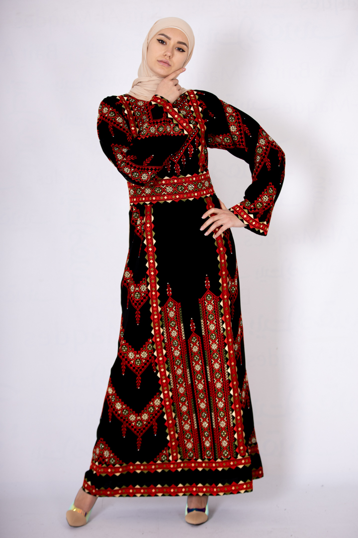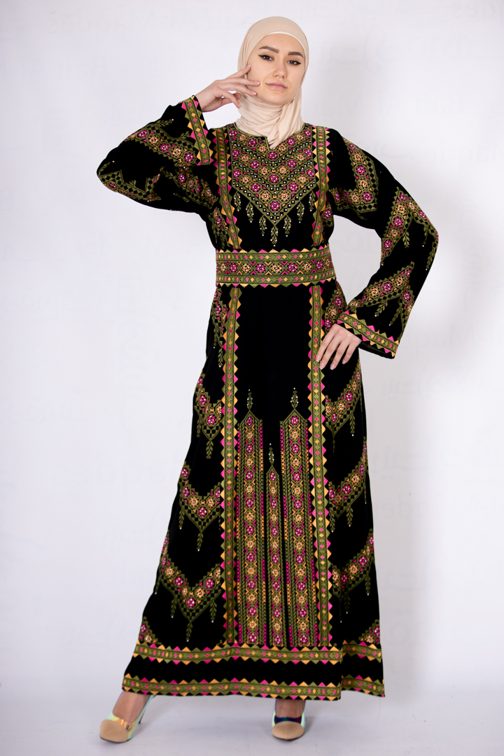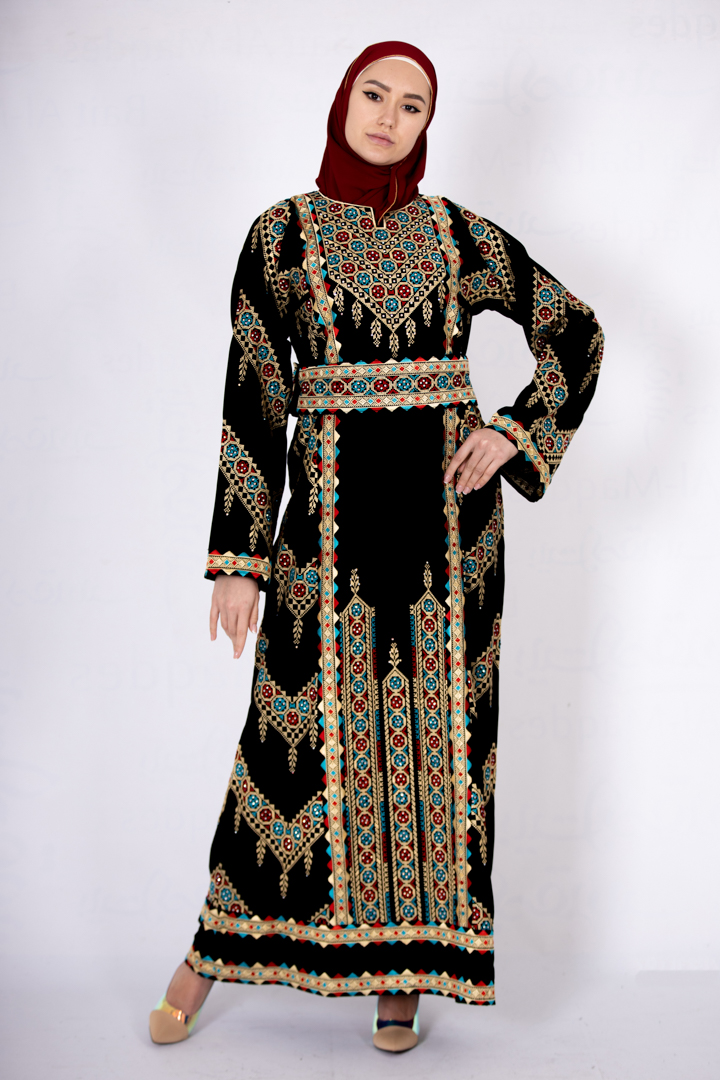ثوب صفد يمتاز بفخامته وأناقة نقشاته، مطرز بخطوط مستقيمة على جوانب الثوب من الأمام والخلف وخطين من الأسفل على محيطه، وعلى أطراف الأكمام، ثوب فلسطيني بنقشات رائعة متوزعة على الأكمام والصدر، مرصع بالستراس اللامع الذي يضيف الجمالية للثوب، مع حزام منفصل مطرز بنفس النقشة.