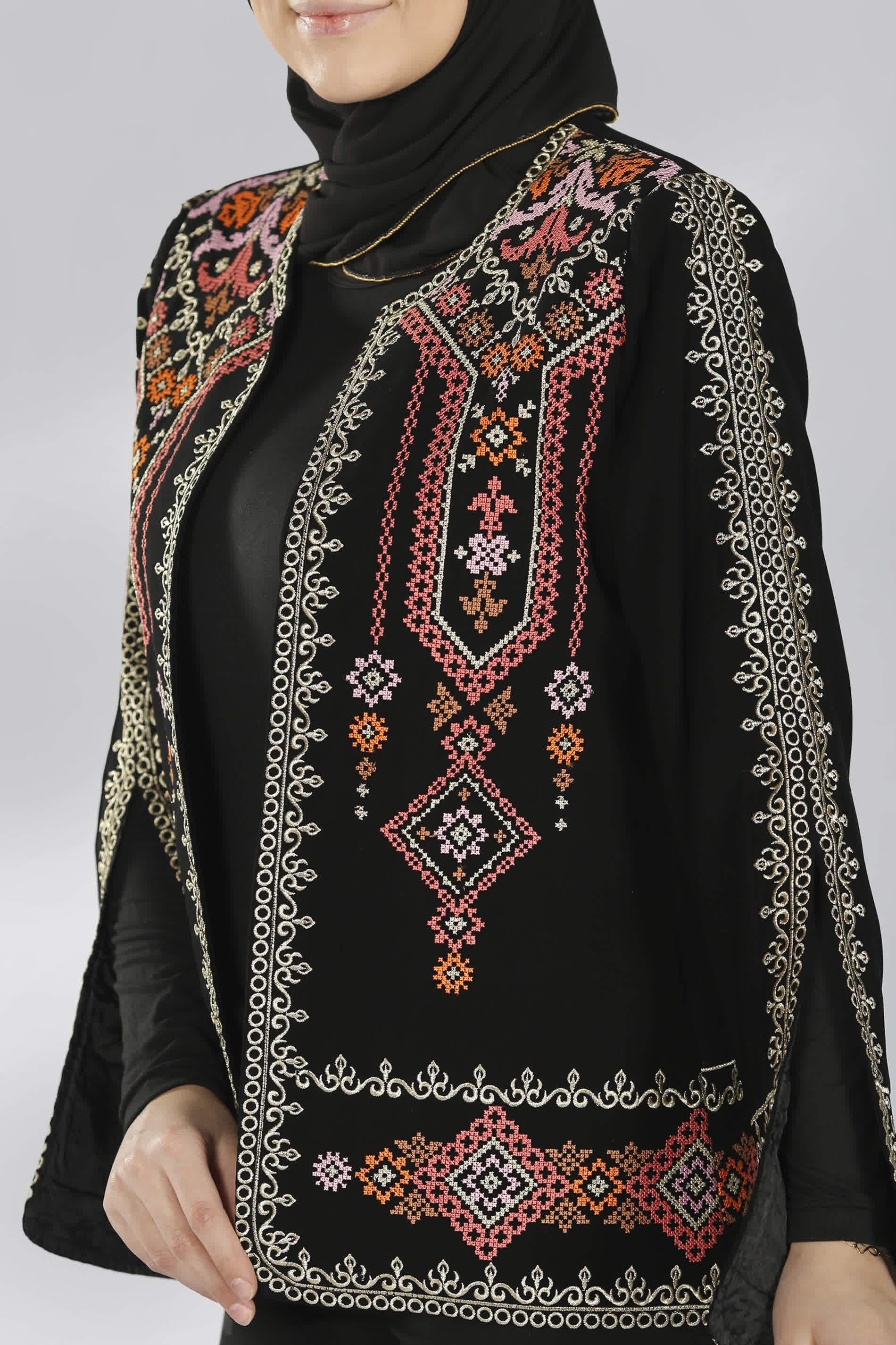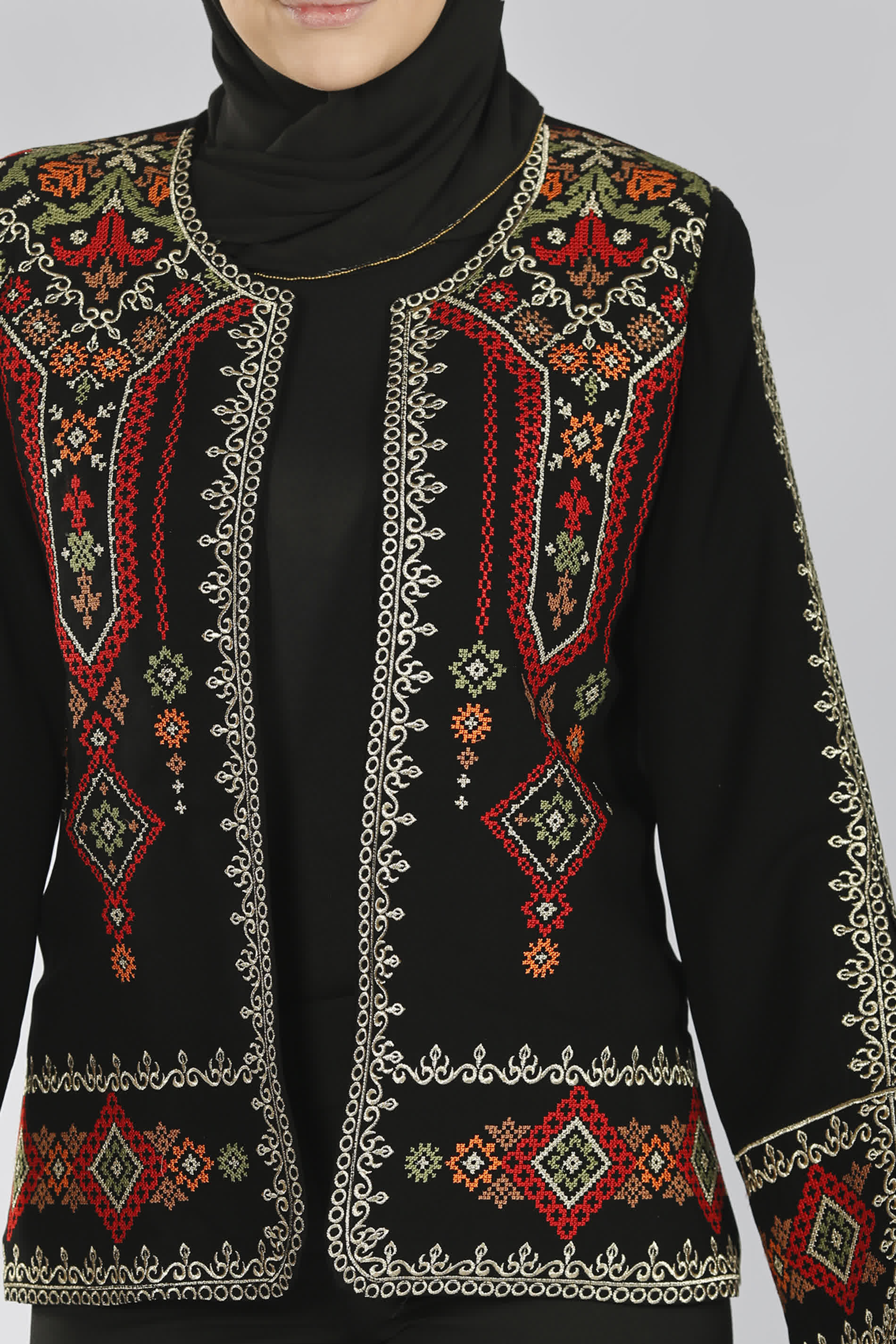 جاكيت مطرز بأفخم النقشات من التطريز الفلاحي العريق بخيط القصب المميز، على قماش الكريب بابل بتفاصيل مميزة تمنحه طابع خاص لن يتكرر، مفتوح بالكامل وبقبة مدورة وأكمام مفتوحة من الأسفل، يأتي بخلفية من اللون الأسود، وألوان تطريز مختلفة لتناسب جميع الأذواق.