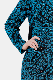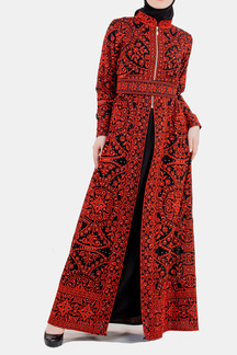 قفطان حوراء المميز يتكون من قطعتين القطعة الخارجية مثالاً لهيبة التراث وفخامته مطرزة بالكامل بتطريز فلاحي وبخيوط من الحرير على قماش الكريب بابل