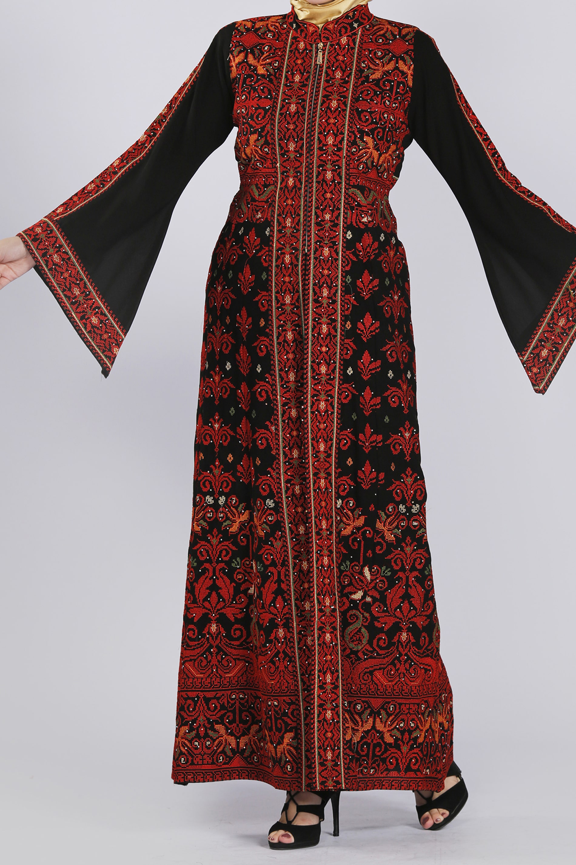 مكون من قطعتين: القطعة الخارجية من قماش الكريب بابل ومطرزة بالغرزة الفلاحية وبخيوط من الحرير ويزينها الستراس اللامع مع حام منفصل مطرز وبقبة ملكية،