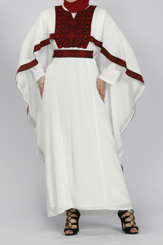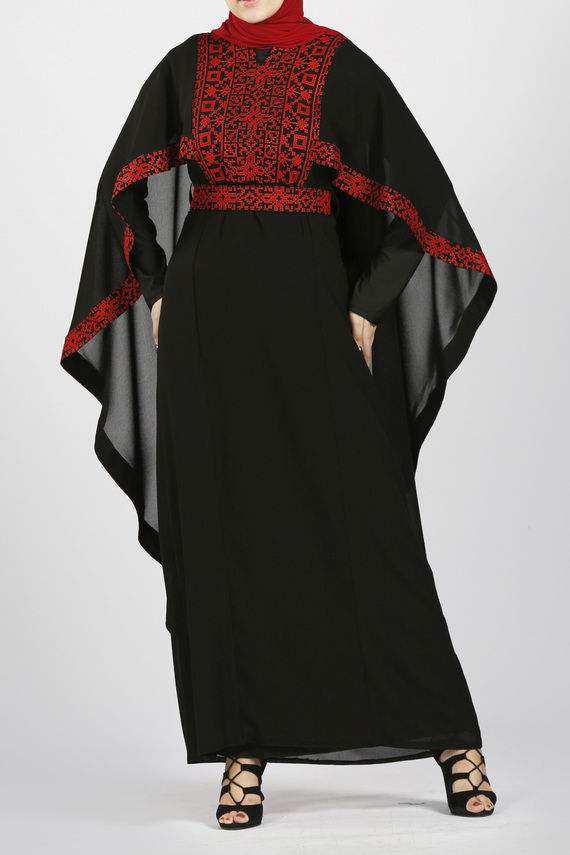 فستان رونق مثال حي لتراث فلسطين، مطرز بأروع النقشات الفلسطينية على قماش الكريب بابل وبخيوط الحرير الصناعي في منطقة الصدر، بتصميم رائع يجمع بين البساطة والجمال، بأكمام ضيقة مع وشاح مطرز بحوافه، يغطي نصف الكم ويمتد في الخلف حتى أسفل القطعة