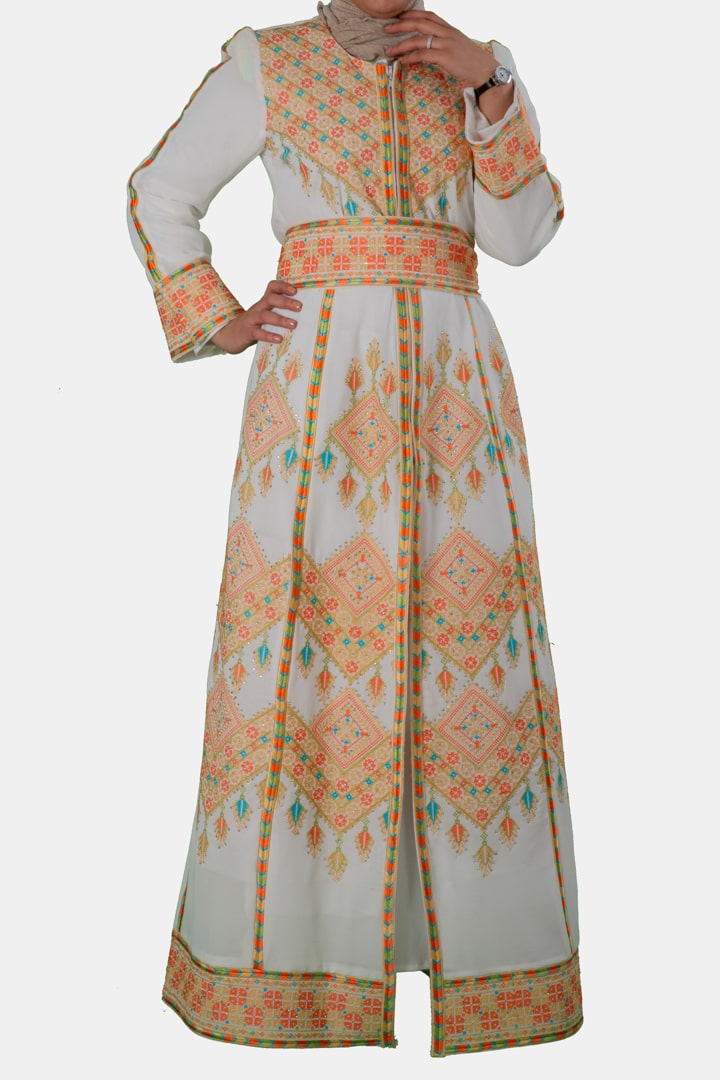 قفطان رام الله بتصميم مغربي وتطريز فلسطيني لجمال لا متناهي، مصمم من قطعتين الأولى بطانة داخلية من قماش الليكرا الناعم