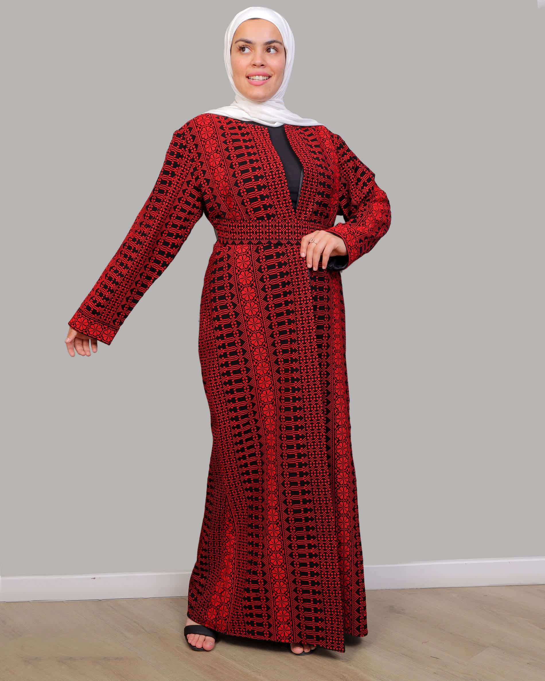 جاكيت فلسطيني طويل، مفتوح من الجوانب ومطرز بنظام تطريز طلس من الأمام والخلف، يأتي مع حزام مطرز منفصل ليزيد من أناقة القطعة.