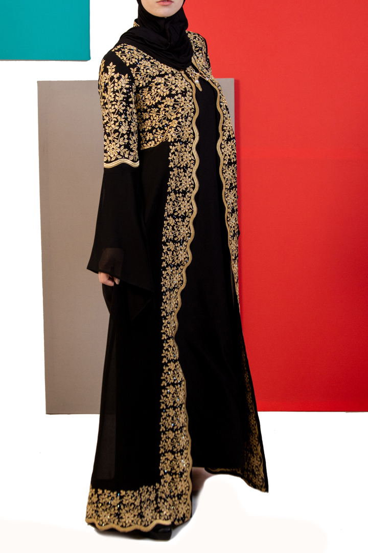 قفطان ملوكي بتفاصيل مميزة مطرز من الأمام بالكامل مع تطريز على أعلى الكم، بقصة كم مفتوحة من الأسفل