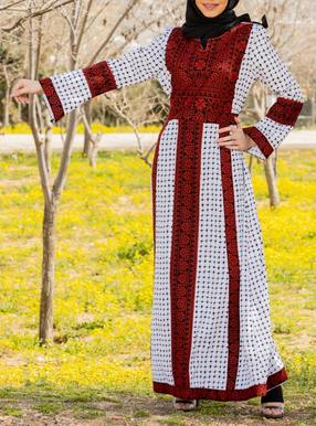 جلابية تراثية بحزام متصل يمكن ربطه من الخلف، ومطرزة على قماش الحطة الفلسطينية.