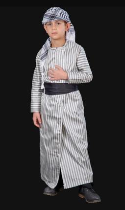 قمباز تقليدي طقم بقطعه الأربعة كاملة؛ الحطة الفلسطينية المهدبة يدوياً والتي يجب أن تتواجد في خزانة كل شخص منا، مع قمباز مصنوع من قماش الصاية والقطن، وشروال من قماش البوليستر، وأخيراً الشملة التي هي عبارة عن قطعة من القماش تربط على الخصر.