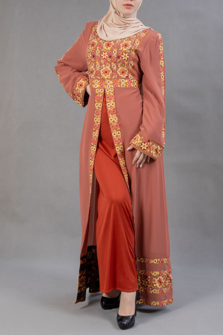 جلابية رحيق لأجمل إطلالة ملوكية، مطرزة بألوان ربيعية صيفية مبهجة على منطقة الصدر وعلى الحواف من الأسفل، وعلى حواف الكم