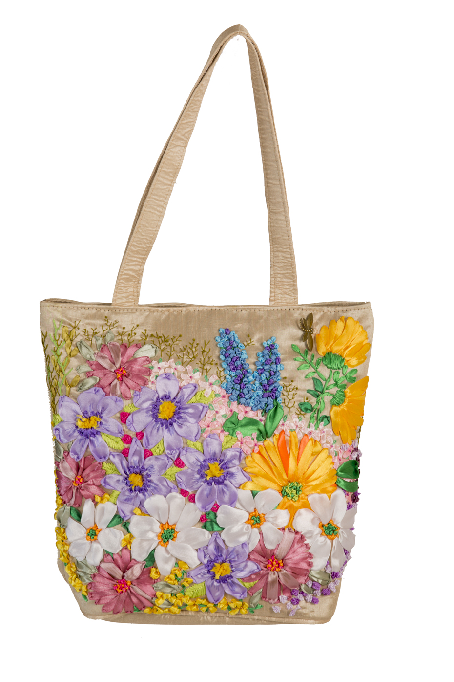 حقيبة مصنوعة من قماش التفتة، مطرز بشرائط الستان(الشبر)، تشكل لوحة من الورود والطبيعة الاخاذة، مأخوذة من الفن الفرنسي الملوكي الفكتوري، يتلائم مع جميع المناسبات والاوقات، ذات تأثير نفسي إيجابي لما تحتويه من عناصر وألوان جمالية أنثوية.