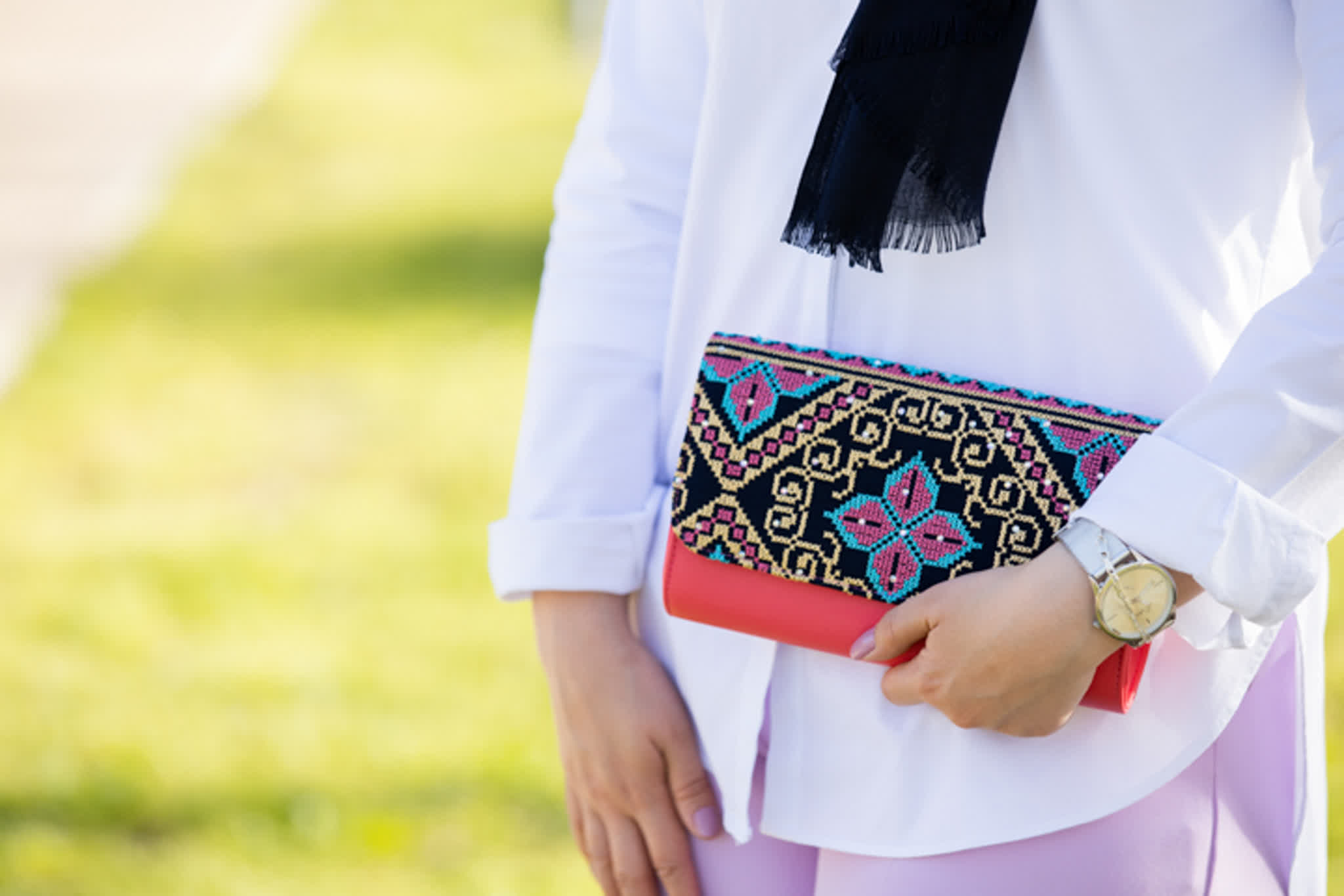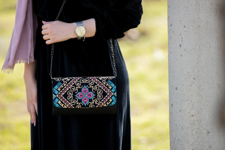 حقيبة كلاتش من الجلد المطرز بأجمل النقشات الفلاحية الهندسية يدوياً، مرصعة بالستراس اللامع تتكون من الداخل من الفوم والاسفنج والكرتون ومبطنة ببطانة من المخمل الفاخر