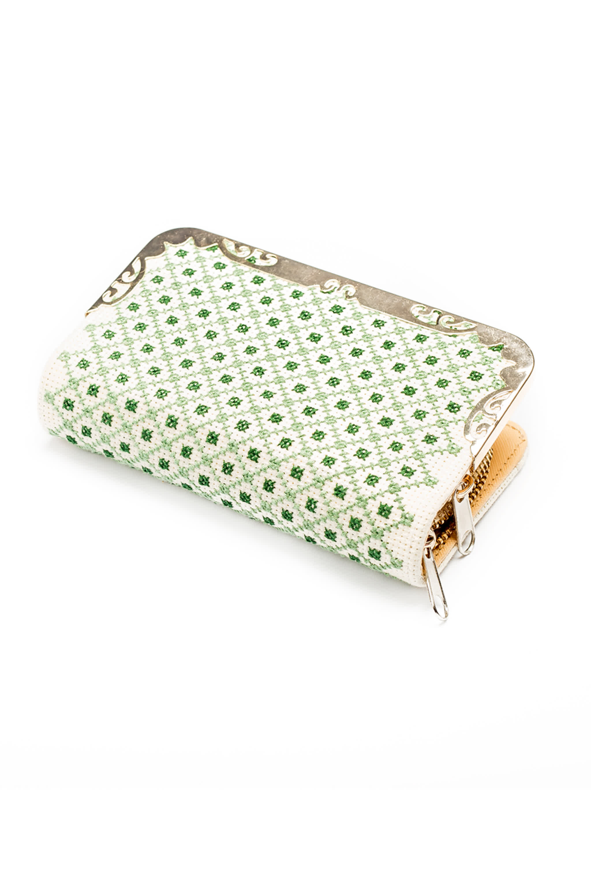 ويأتي بثلاثة أقسام من الداخل مع أماكن لوضع بطاقات الصراف والهوية، ومطرز بخيط أخضر من الحرير الصناعي.