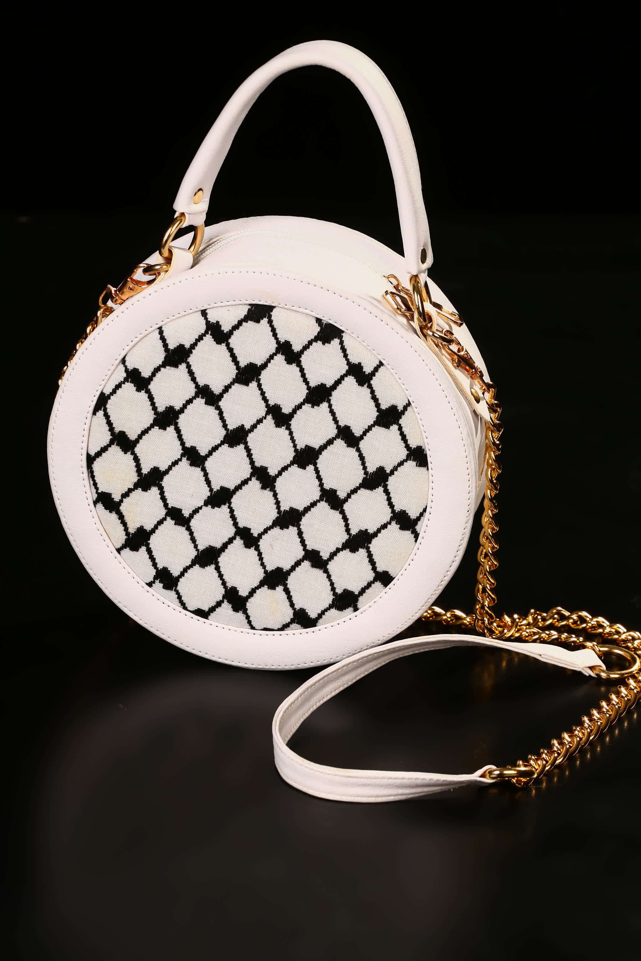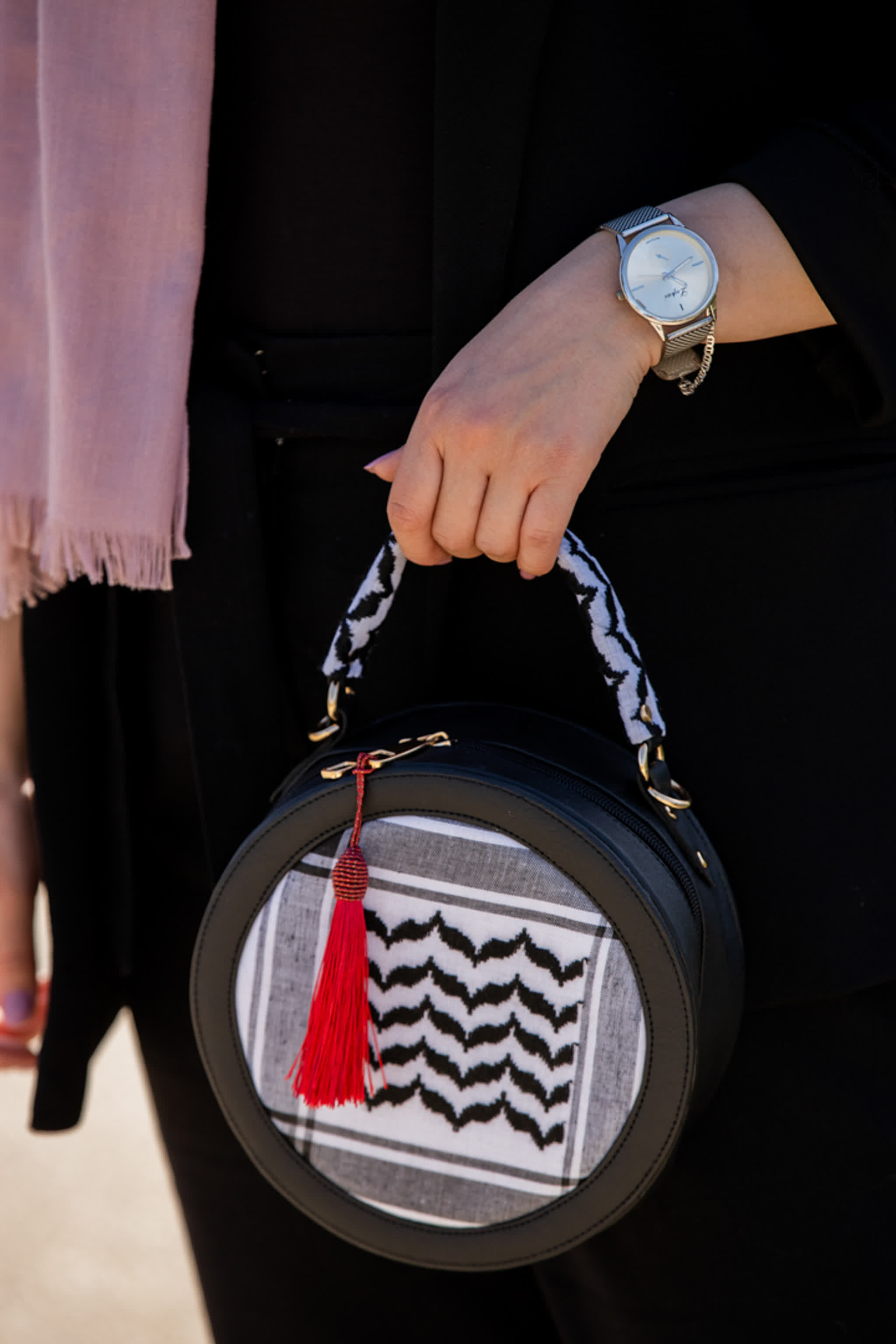 حقيبة يد على شكل دائري من الجلد مطرزة من الأمام والخلف وعلى اليد بنقشة الحطة الفلسطينية المميزة بالأبيض والأسود مبطن من الداخل ببطانة مخمل مع شراشيب على السحاب من الخارج مضاف إليها يد خارجية