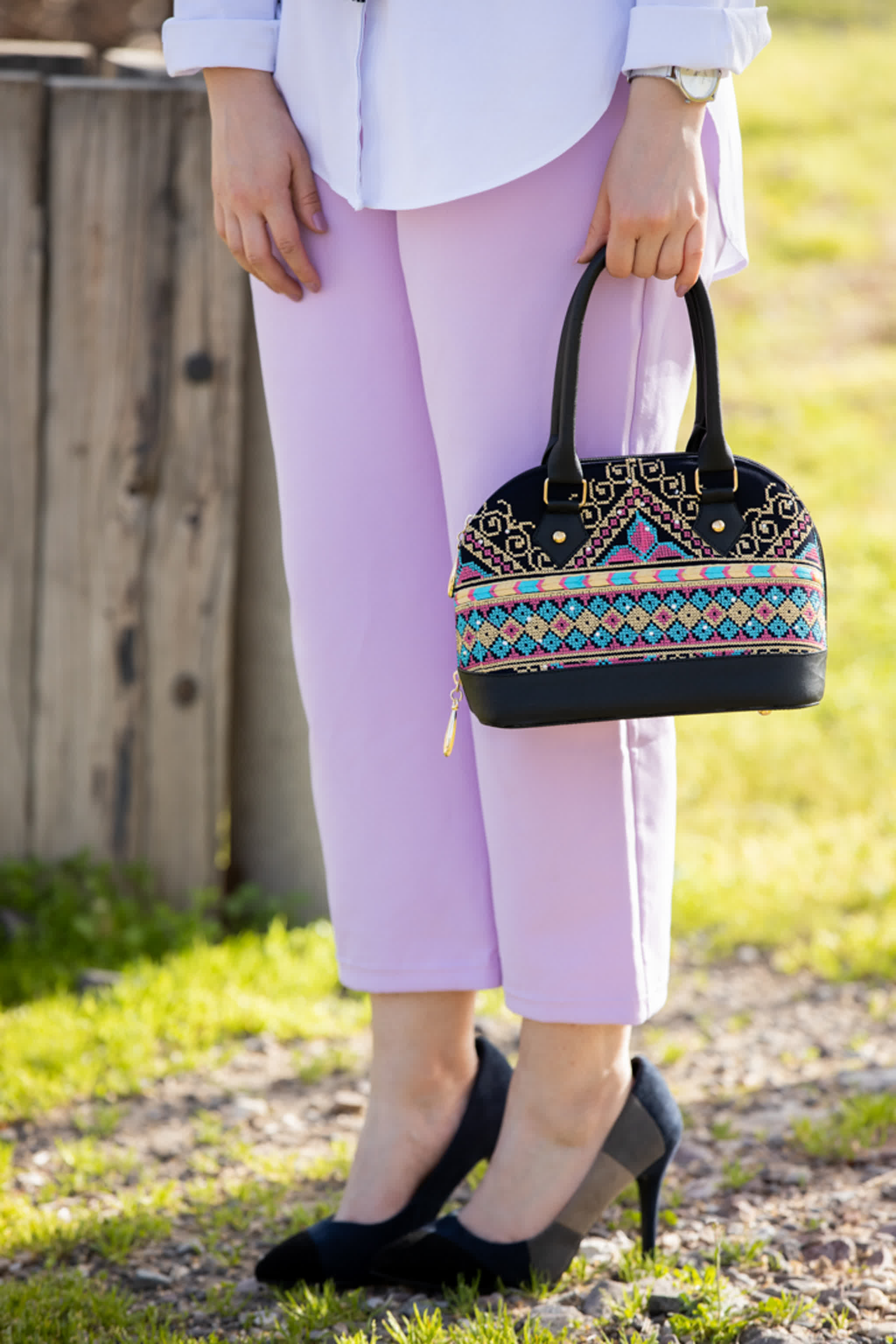 حقيبة يد مميزة بأفخم نقشات التطريز مصنوعة من خامة جلد عالية الجودة، ومبطنة من الداخل ببطانة من المخمل ليزيدها فخامة ورقي