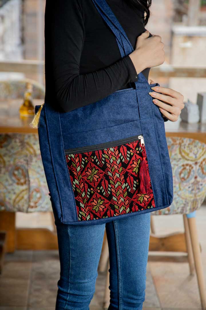 حقيبة كتف كبيرة مصنوعة من خامة الجينز ومطرزة بالتطريز الفلسطيني المميز على شكل نجوم الحقيبة مزينة بشراشيب وجيوب داخلية