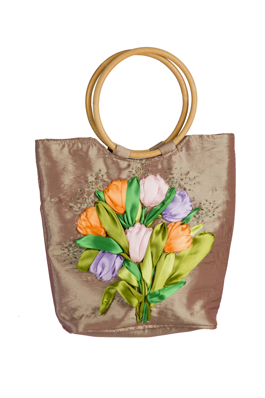 حقيبة مصنوعة من قماش التفتة اللامع المموج، مطرز بشرائط الستان (الشبر) ليشكل لوحة لورود التوليب الملونة، المأخوذة من الفن الفرنسي الملكي العريق، وأيدي مصنوعة من خشب الخيزران.