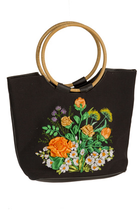 حقيبة مصنوعة من الأمام من قماش الكريب، ومن الجلد الصناعي من الخلف مطرزة بشرائط الستان(الشبر) وخيوط الحرير.. لتعطي لوحة فنية متكاملة تعكس الفن الفكتوري الفرنسي بفخامته وأناقته وتفرده، والأيدي مصنوعة من خشب الخيزران، الشنطة من الداخل قسم واحد مع سحاب داخلي وتغلق الشنطة بزر مغناطيسي