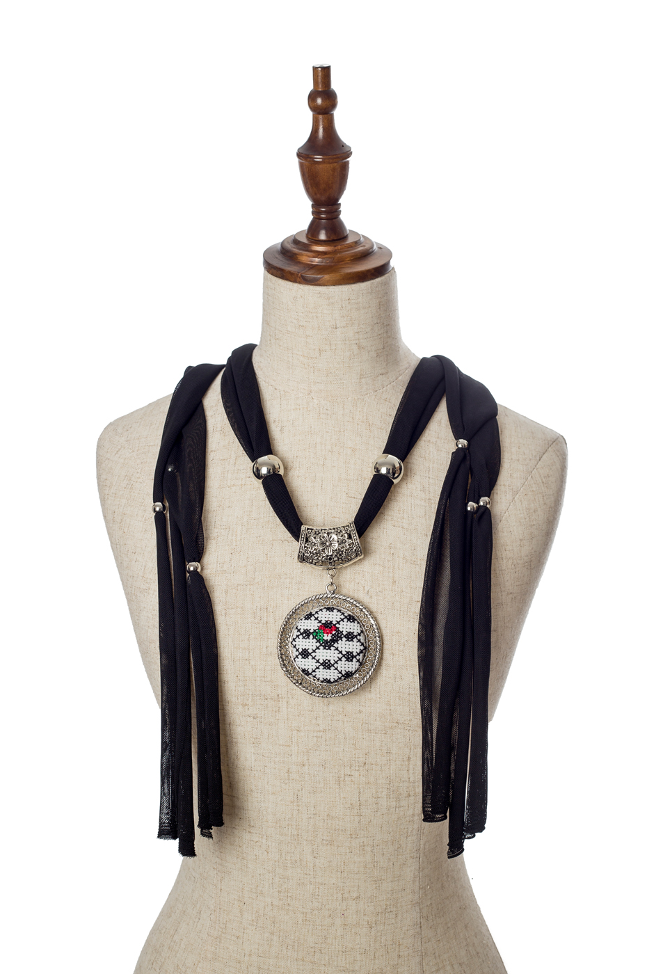 سكارف فلسطين منقوش من الشيفون مع قلادة من الأنتيك مطرزة بالتطريز الفلسطيني بألوان الكوفية الفلسطينية رمز الثورة والبهاء مع نقشة العلم الفلسطيني بخيط الحرير