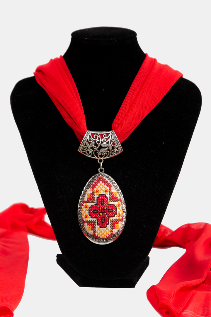 سكارف قرص الريش مصنوع من قماش الشيفون مع قلادة من الأنتيك مطرزة بالتطريز الفلسطيني بخيط الحرير بنقشة فلاحية مشهورة تُدعى قراص الريش، تتمازج فيه الألوان لتزيني به إطلالتك على مدار اليوم، صنعته لك بحب إحدى الصبايا المحترفات من نابلس يمكنك تنسيقها مع البدلات الرسمية لإطلالة مكتبية أنيقة، أو في طلعات المساء مع العائلة والأصدقاء.
