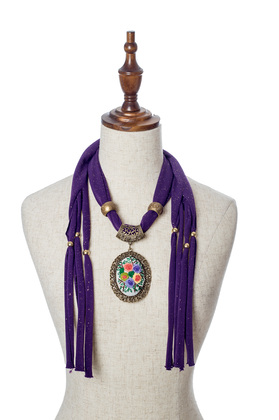 سكارف من قماش الليكرا بلمعة مع قلادة من الأنتيك مطرزة بالتطريز البرازيلي المميز بخيط الحرير ومزين بخرز من الخلف، بتمازج أنيق في الألوان لتزيني به إطلالتك على مدار اليوم.