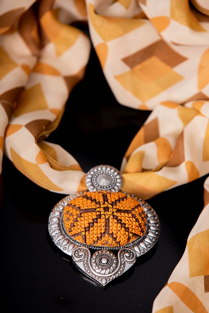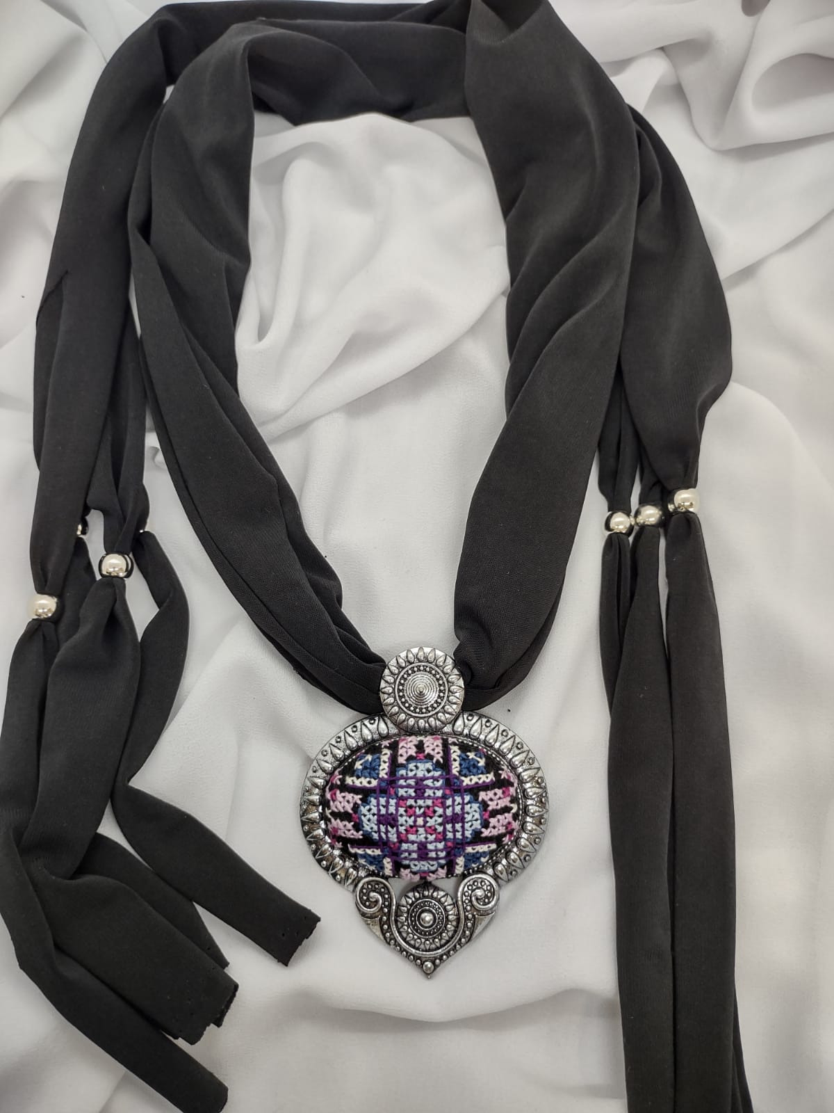 سكارف من قماش الليكرا مع قلادة من الأنتيك مطرزة بالتطريز الفلاحي مشغولة بخيط الحرير الأنيق