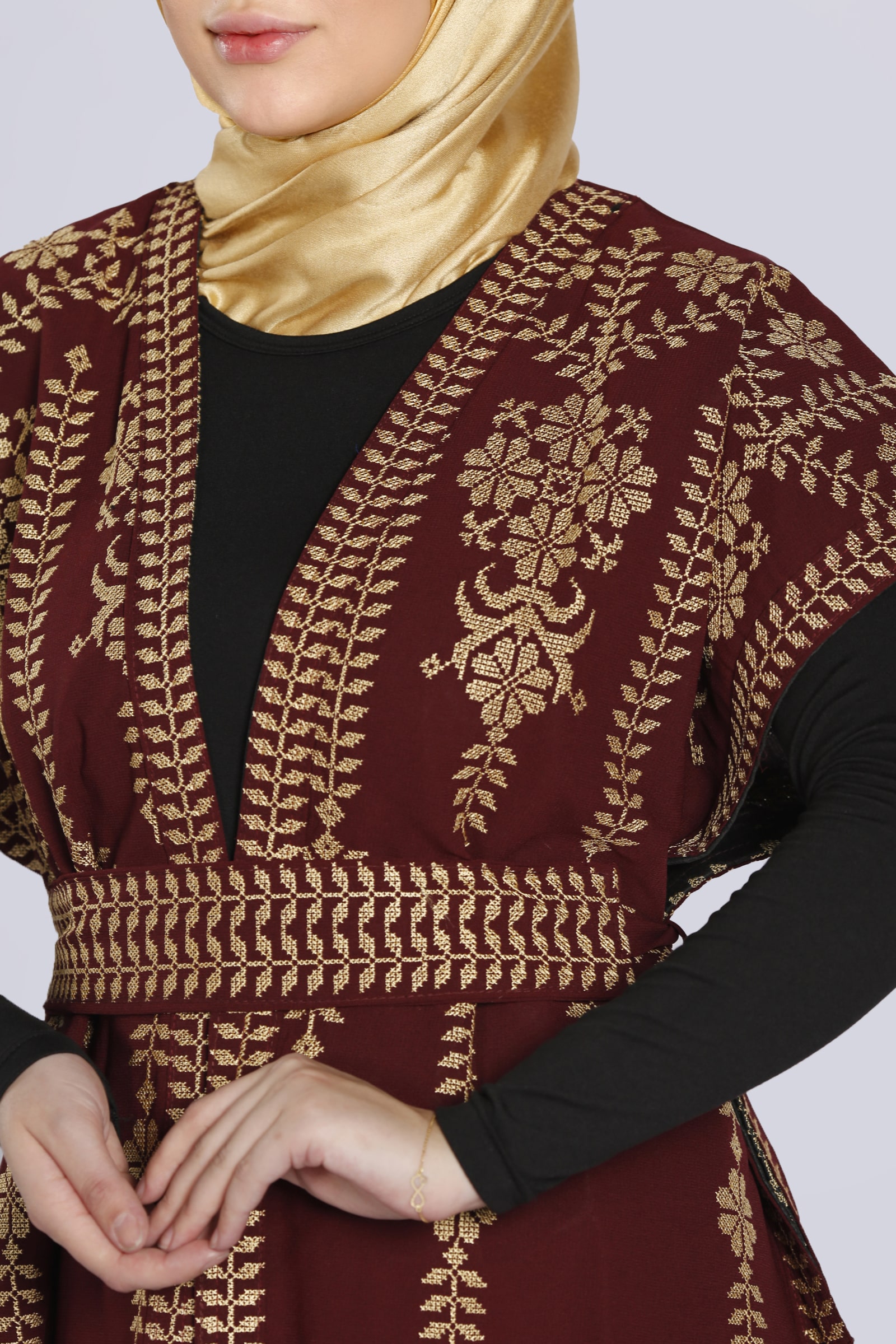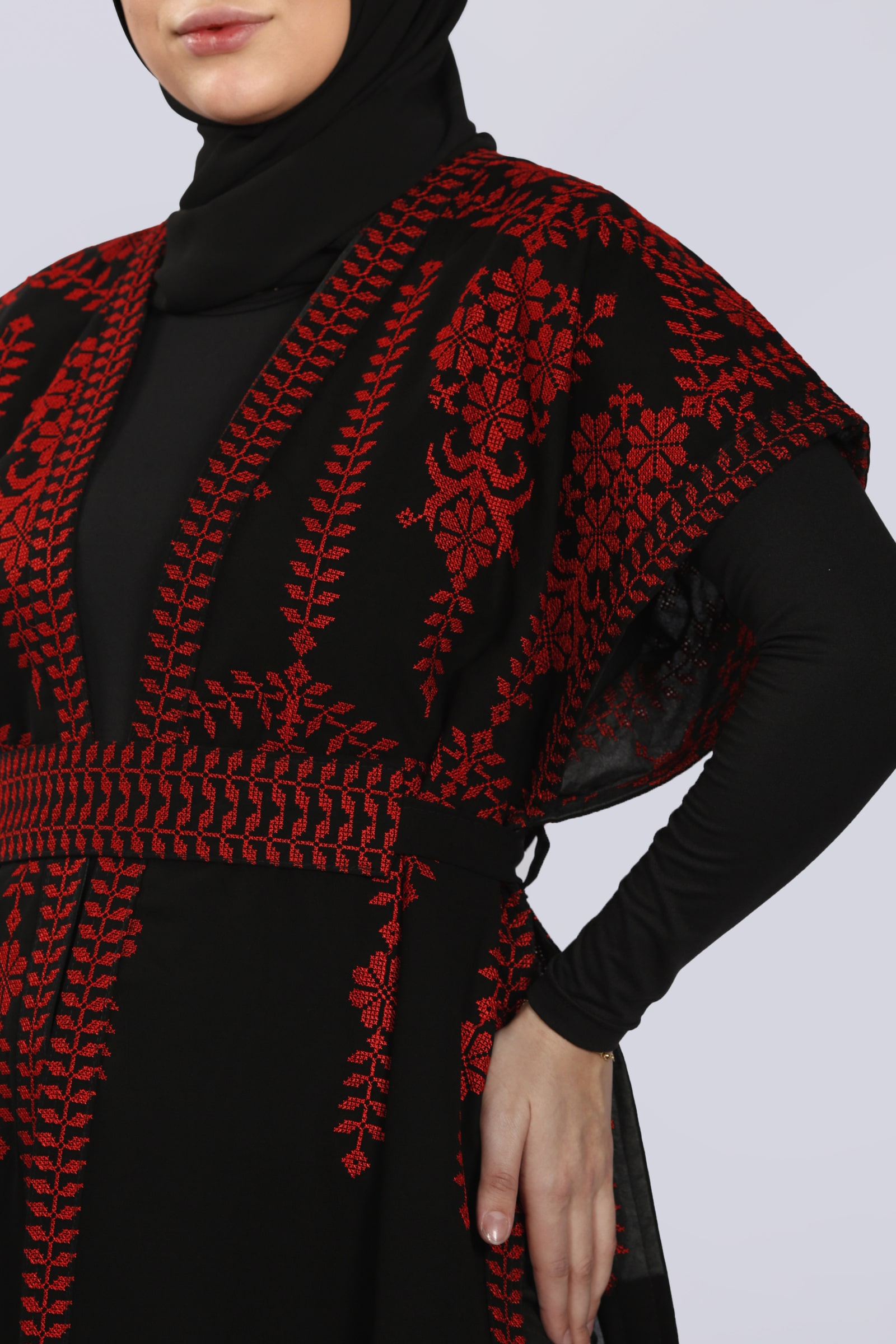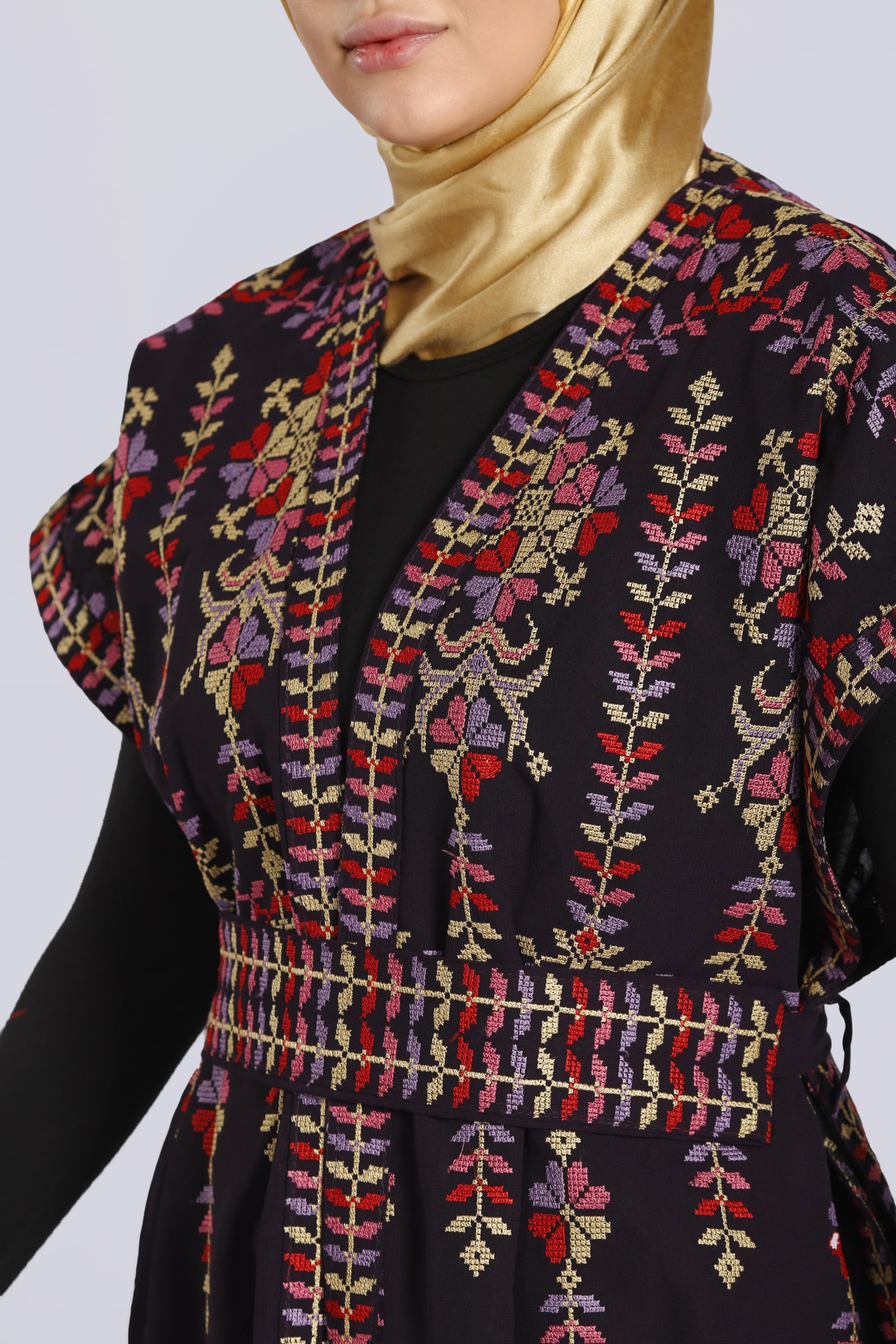 بشت مميز بلا أكمام ومفتوح من الجنب، يأتي بحجم واحد بقصة فضفاضة تناسب حتى وزن 110، يمتاز بسهولة الحركة فيه، وتفاصيله التي تزيده نعومة وفخامة، مع حزام مطرز منفصل.