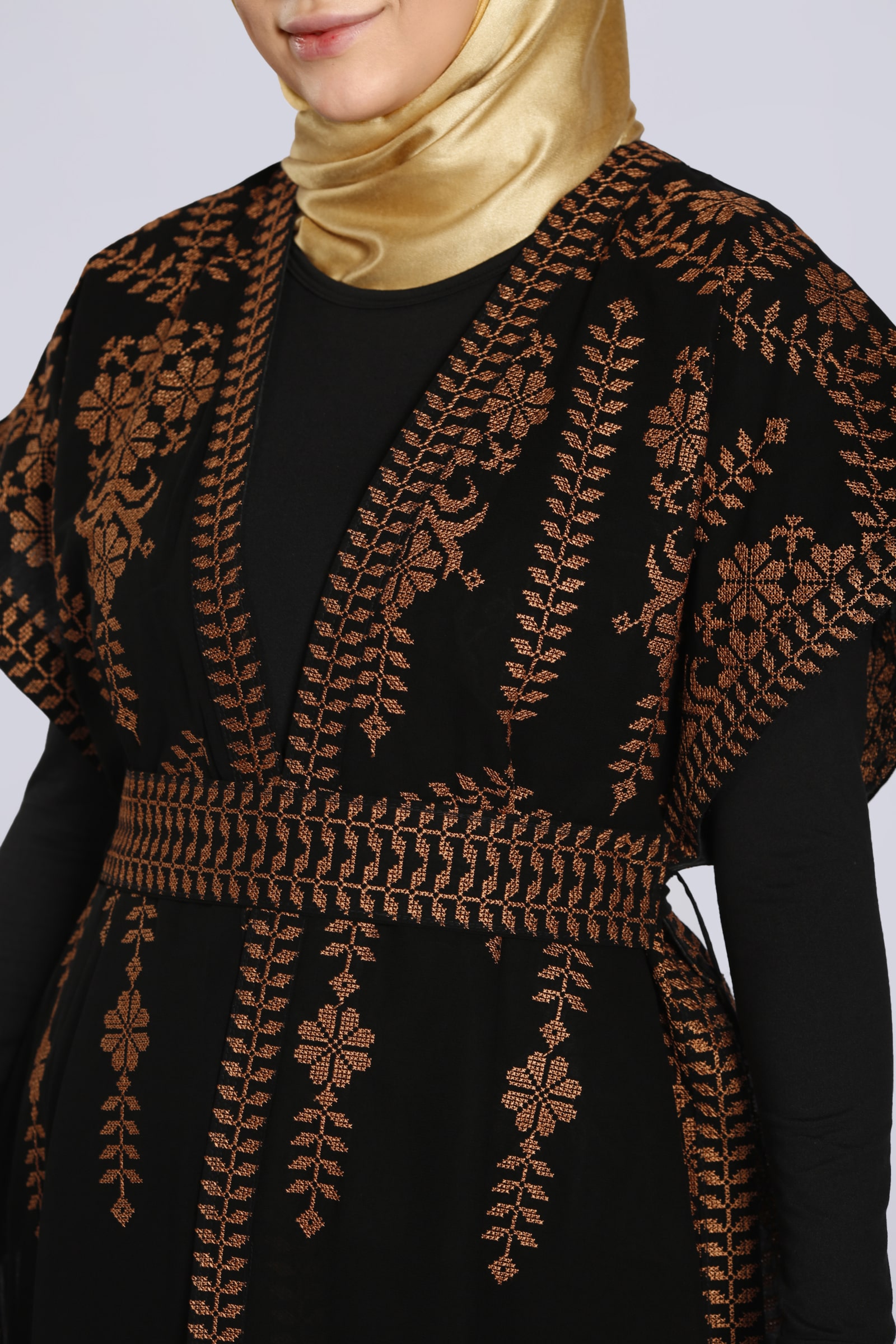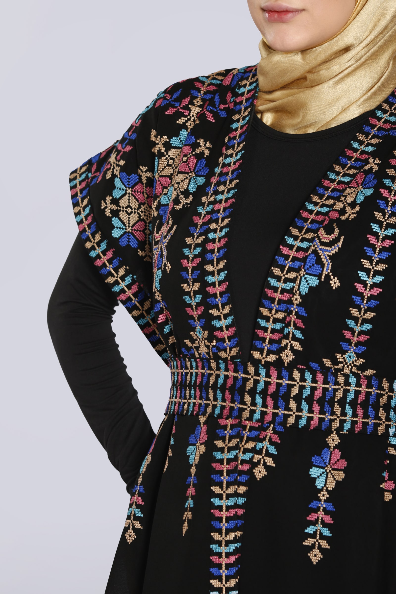 بشت نغم بألوانه اللامعة والبراقة التي تضفي إليه جمالاً وأناقة، مطرز بتطريز فلاحي يجمع بين التراث وروح التصاميم الحديثة على قماش الكريب بابل الناعم