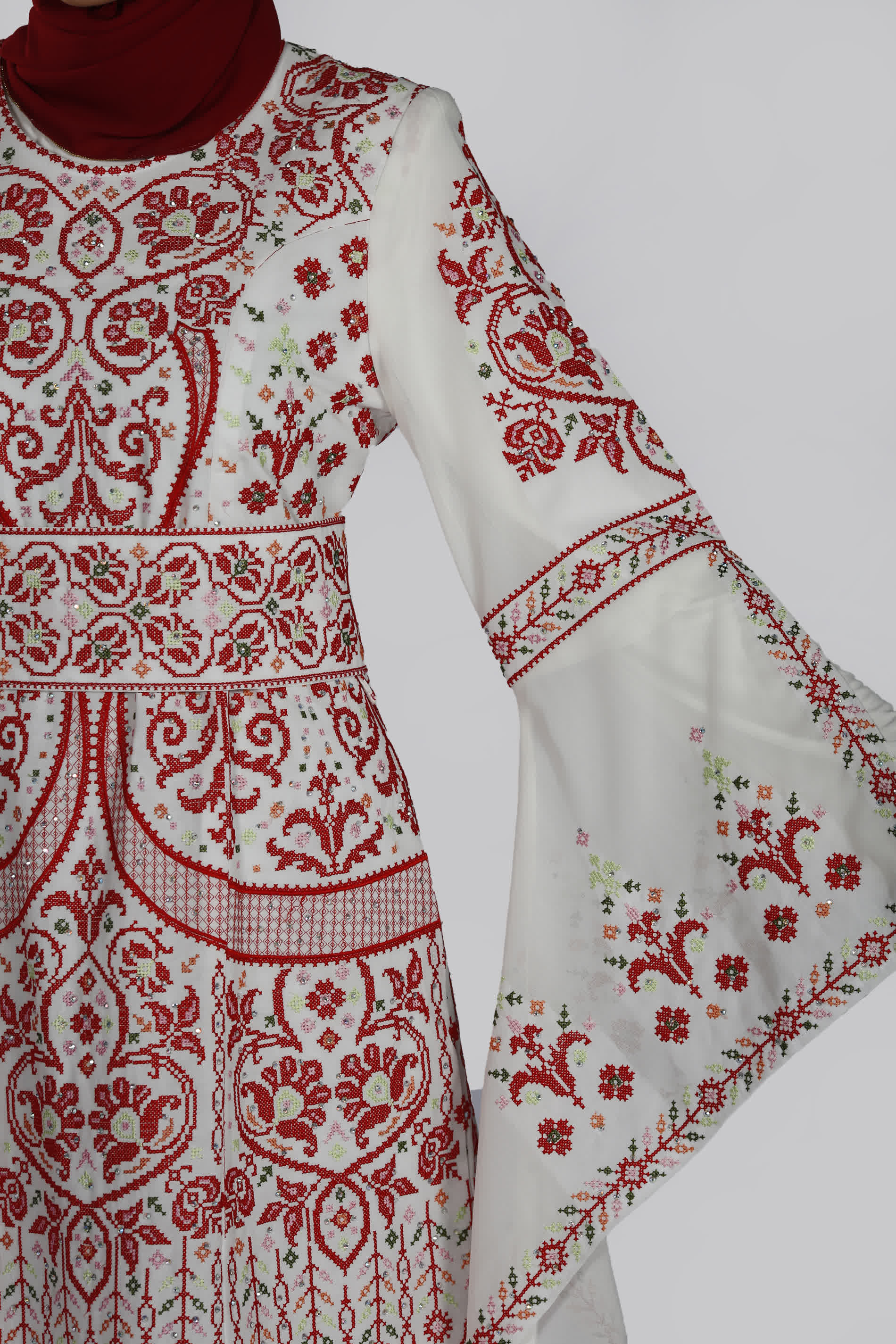 فستان نجوى بتصميم عصري لافت، مطرز بأجمل النقشات التراثية على قماش الكريب بابل من الأمام والخلف، بخيوط الحرير الصناعي، بقبة مدورة وسحاب خلفي، مع بطانة منفصلة.