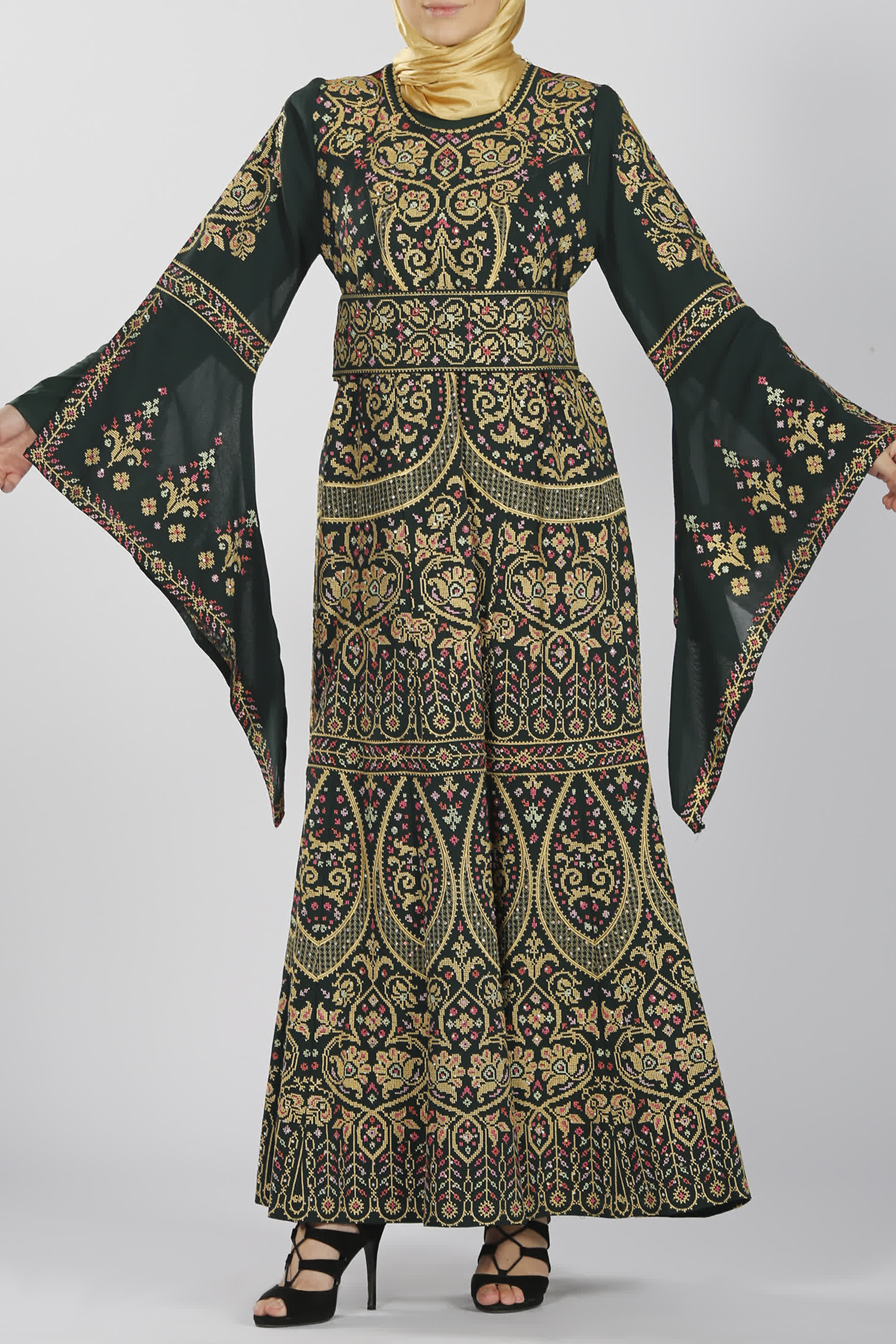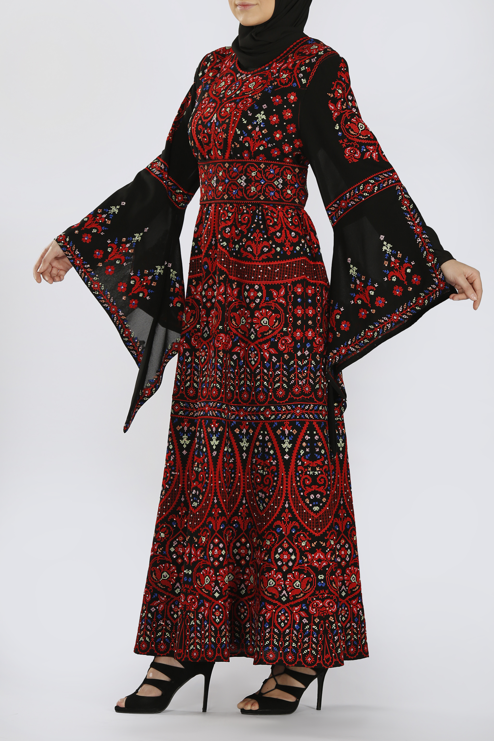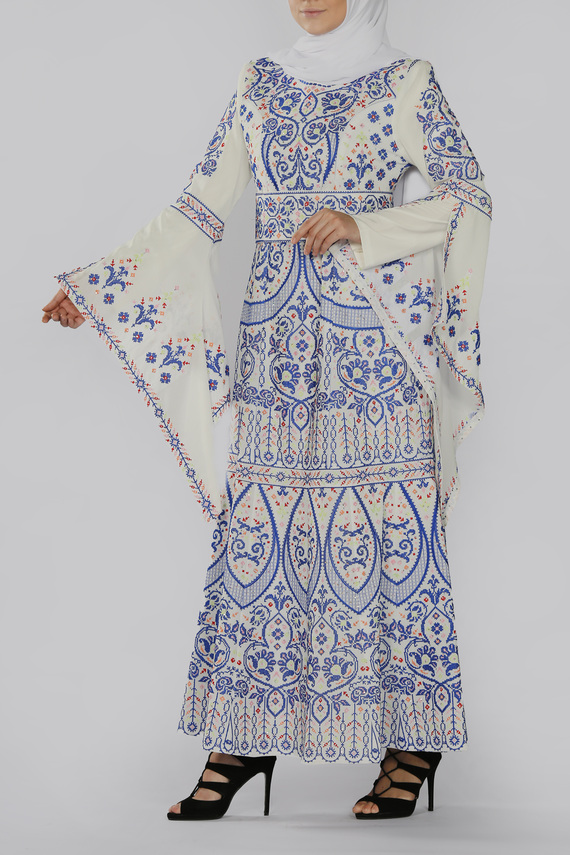 فستان ضيق من الخصر مع حزام منفصل مطرز بنفس النقشات المميزة، وأكمام جرس تكمل الطلة البهية لهذا الفستان.