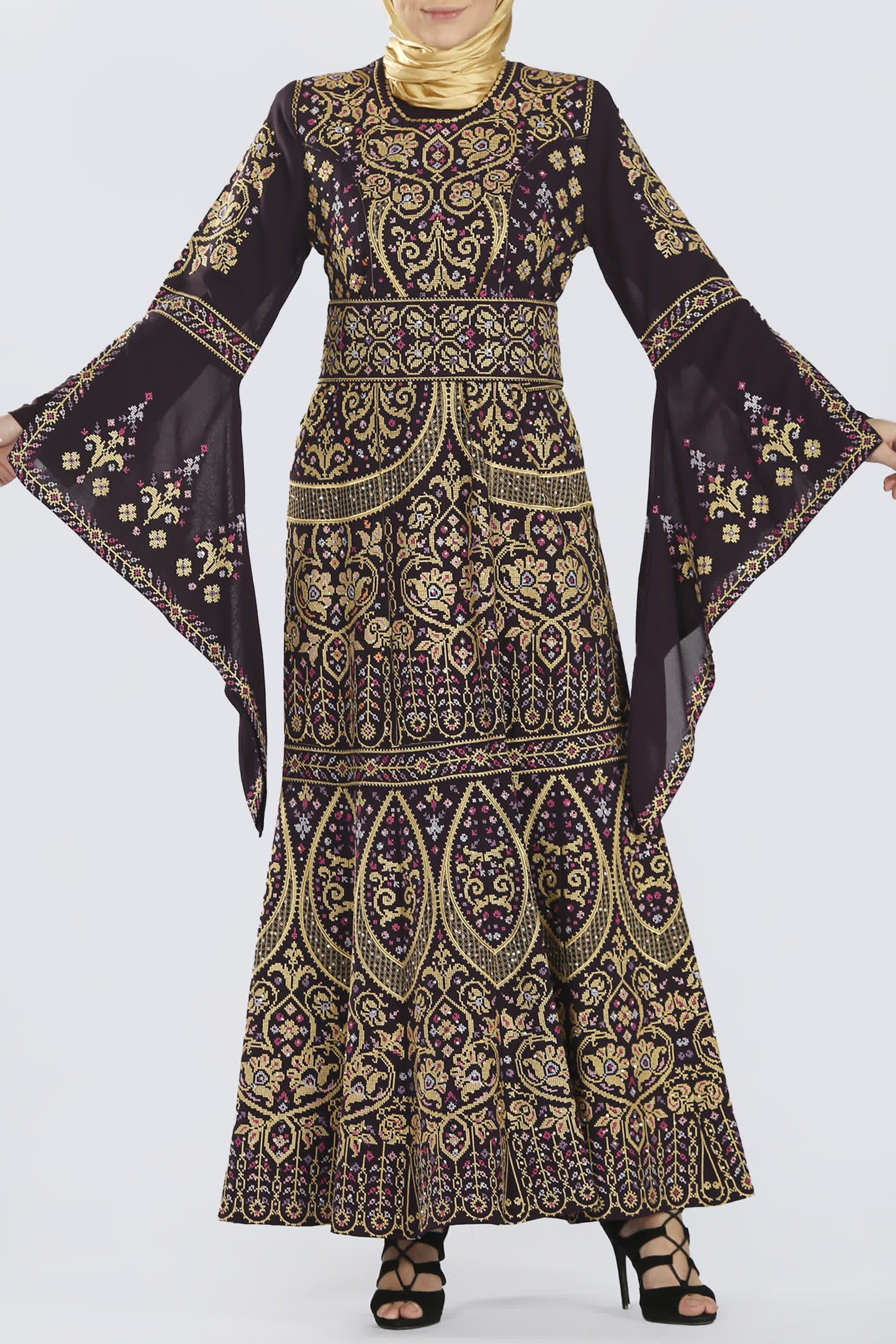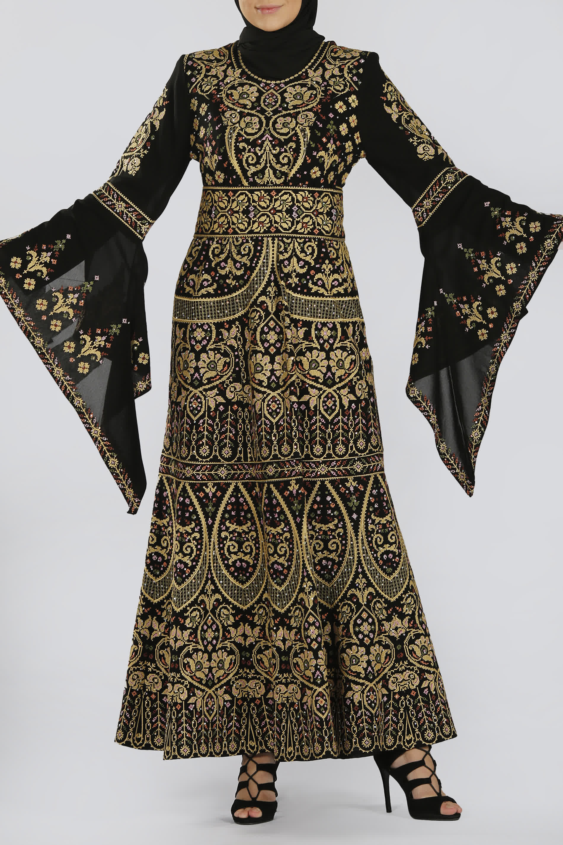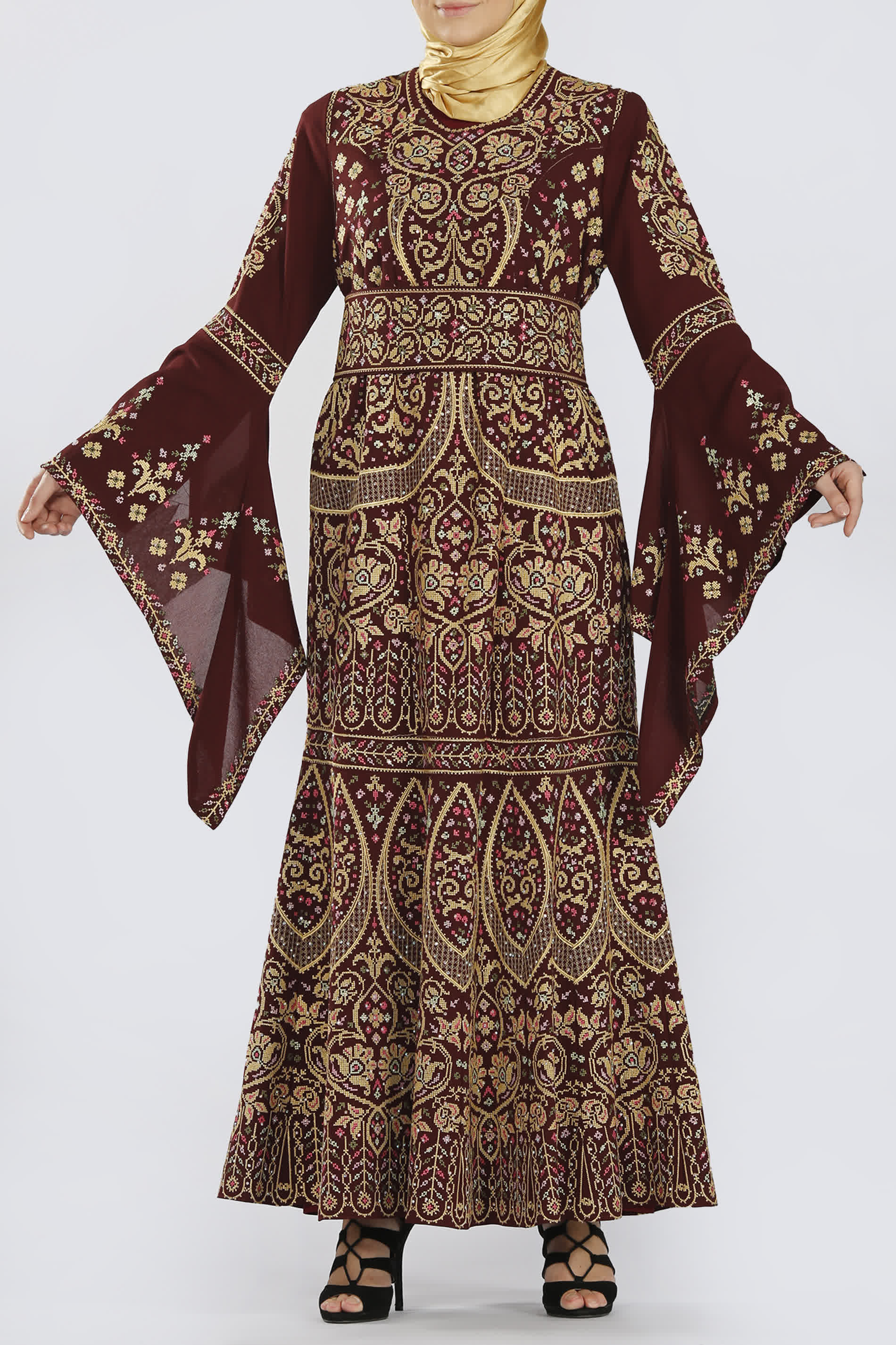 فستان ضيق من الخصر مع حزام منفصل مطرز بنفس النقشات المميزة، وأكمام جرس تكمل الطلة البهية لهذا الفستان.