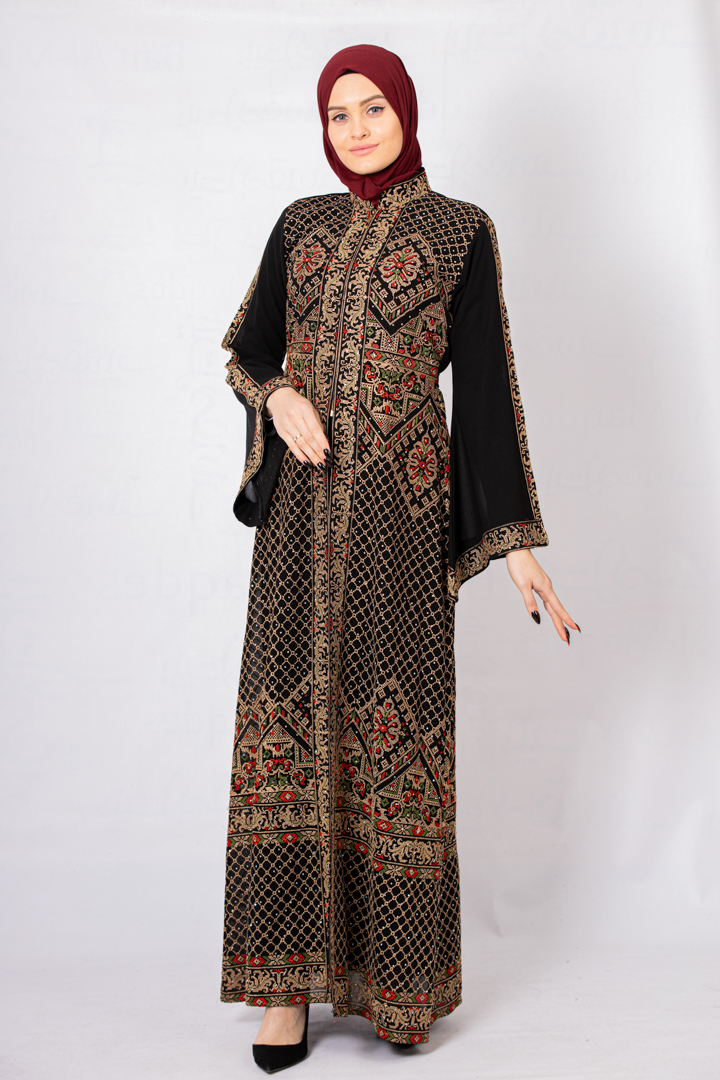 قفطان جنى بتصميمه الفاخر والعصري يتربع على عرش الأناقة، بتطريز عصري يزين كامل القطعة من الأمام والجزء السفلي من الخلف، بسحاب أمامي يمتد للمنتصف، وأكمام واسعة مطرزة بتصاميم فريدة مختارة بعناية.