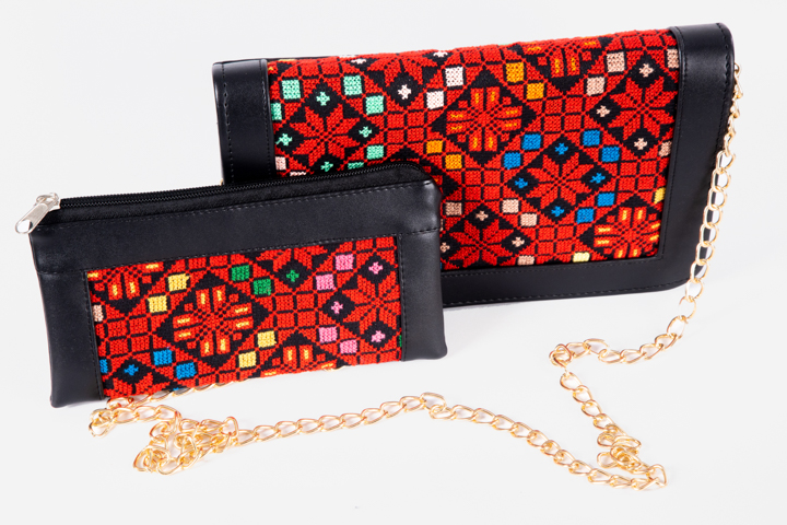 حقيبة كلاتش مطرزة يدوياً مع محفظة مرافقة تحمل نفس الرسومات والتقشات الفلسطينية والتي تتلخص برسومات لنجوم وأشكال تطريزية مبهرة.