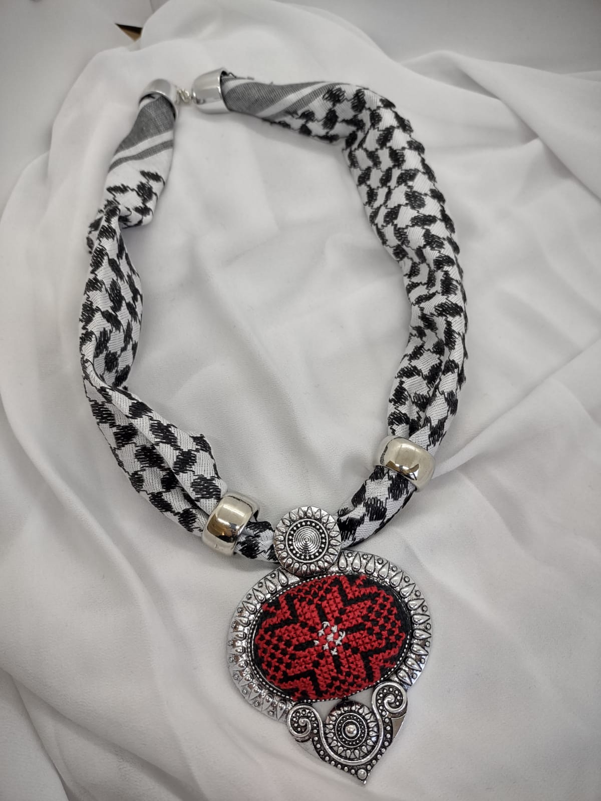 المميز المنسوج بالابيض والأسود، مع قلادة بيضوية الشكل محاطة بالمعدن