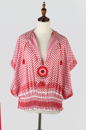 بلوزة كروشيه الشماغ بتصميمها المميز، وألوانها المأخوذة من وحي التراث والثقافة الأردنية الأصيلة، مصنوعة من قماش الشماغ بألوانه البهية والمميزة وبتصميم فراشة مفتوح من الجوانب، مع زم بمطاط من الأسفل ليمنحها طابع خاص