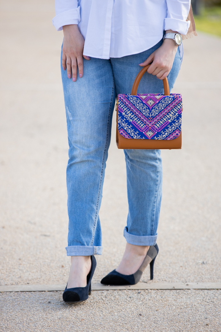 حقيبة يد مميزة مصنوعة من خامة عالية الجودة من الجلد مطرزة بتطريز هندسي على شكل مثلثات من الأمام،