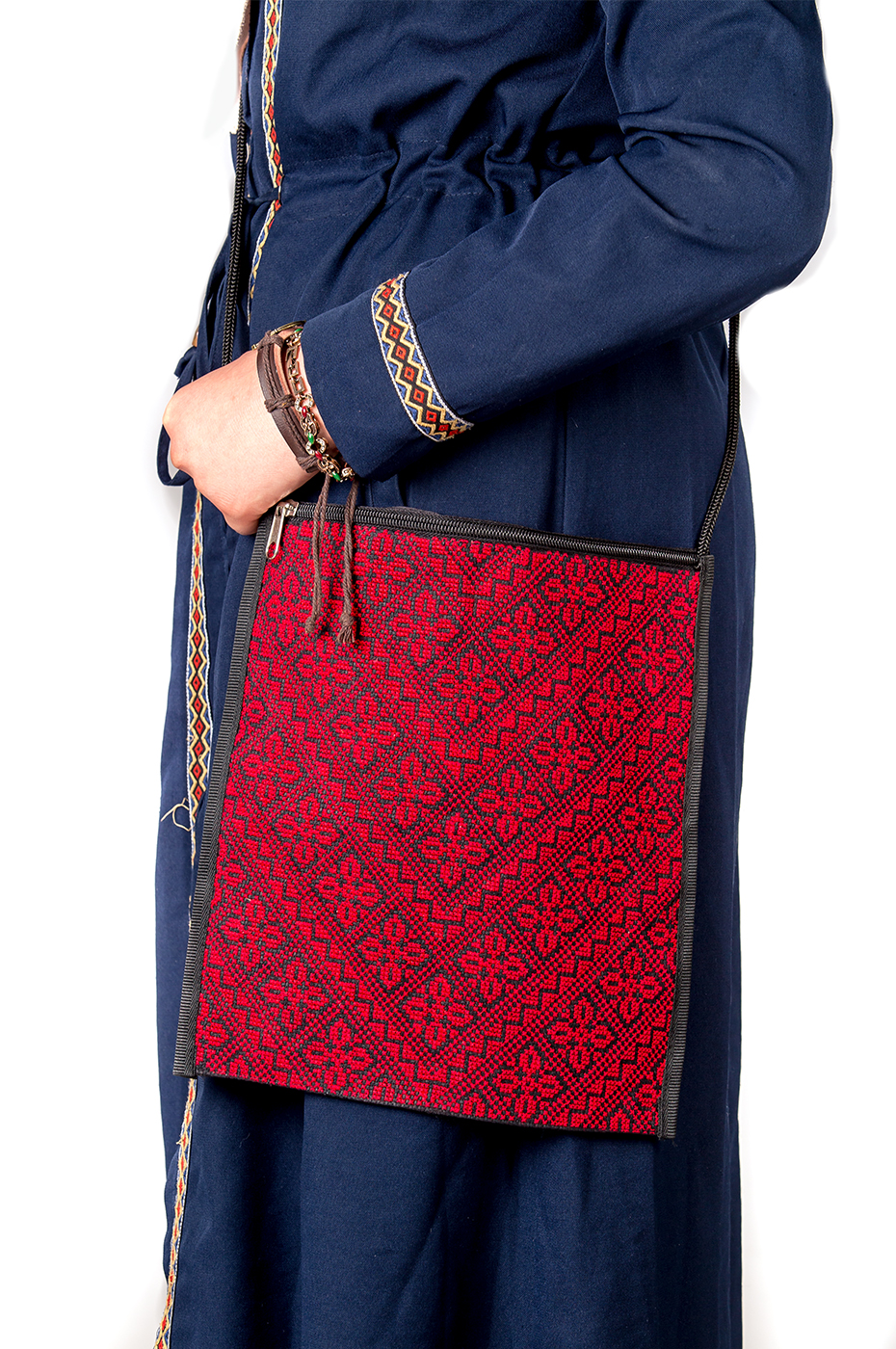 حقيبة مميزة مصنوعة من القماش ومطرزة بالتطريز الفلسطيني المميز على شكل نجوم، مع شيالات طويلة يمكن لبسها كروس وسحاب للإغلاق