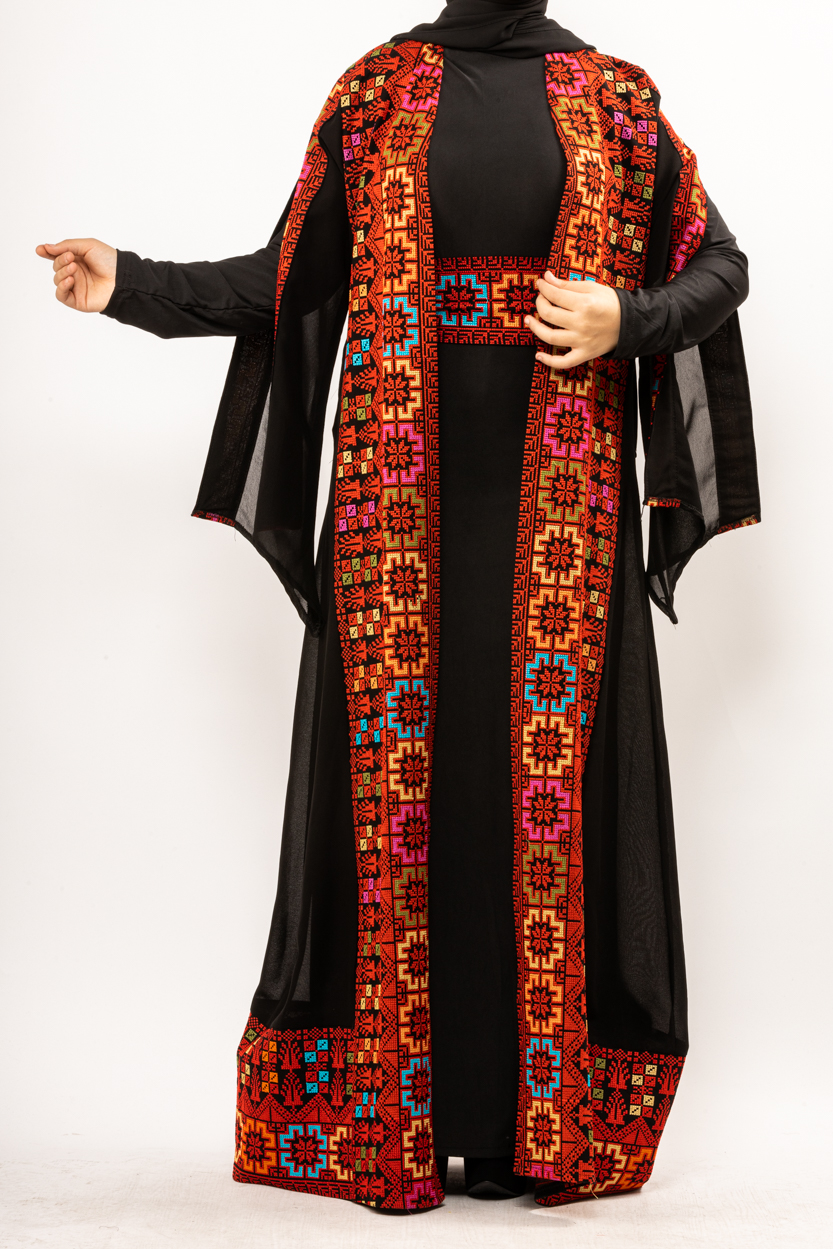 عباية أماني خاصة بالمناسبات المميزة التي تحتاجين فيها لمظهر مبهر يسرق الأضواء، مطرزة بتطريز ناعم من الأمام مع أكمام جرس