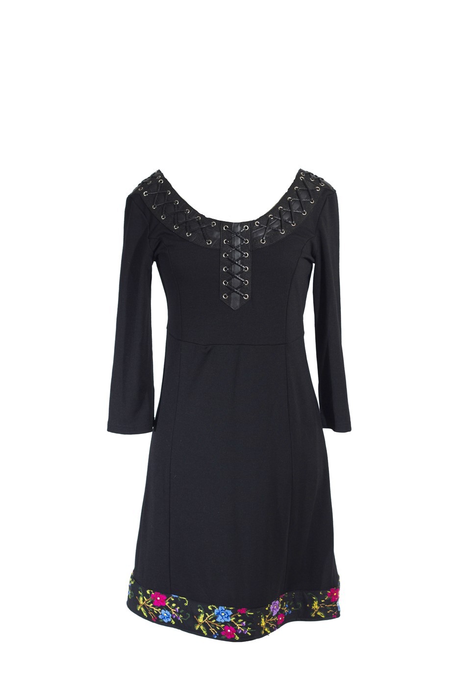 فستان قصير مميز بتطريز بروتو جميل على حوافه من الأسفل، بسحاب خلفي يمتد حتى منتصف الظهر، وياقة دائرية مفتوحة مزينة برباط موضوع على شكل حرف x
