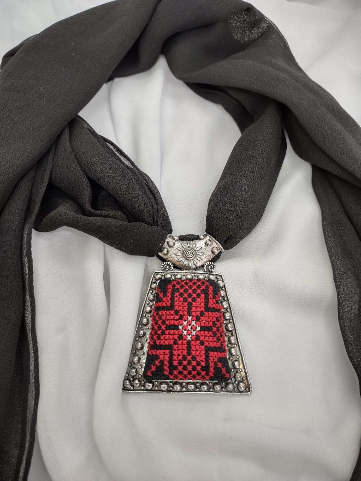 سكارف مع قلادة مطرزة بالتطريز الفلاحي باللونين الأسود والأحمر، من قماش الشيفون ومزين بشراشيب بنهايته