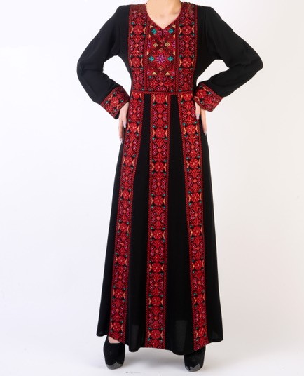 ثوب فلسطيني بتصميم ثلاثة عروق مطرزة بأجمل النقشات الفلاحية التي لا تقدم مهما طال عليها الزمن ليكون ثوب كل زمان ومكان
