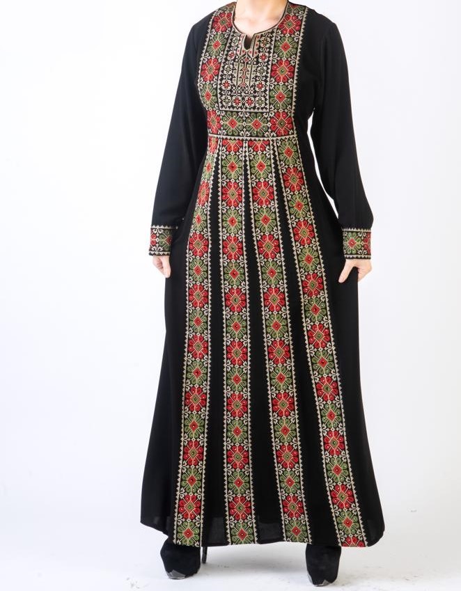 ثوب المها مطرز بنقشات فلسطينية تحيي روح التراث عند من يرتديه، بتطريز فلاحي مكون من ورود مميزة بألوان جميلة.