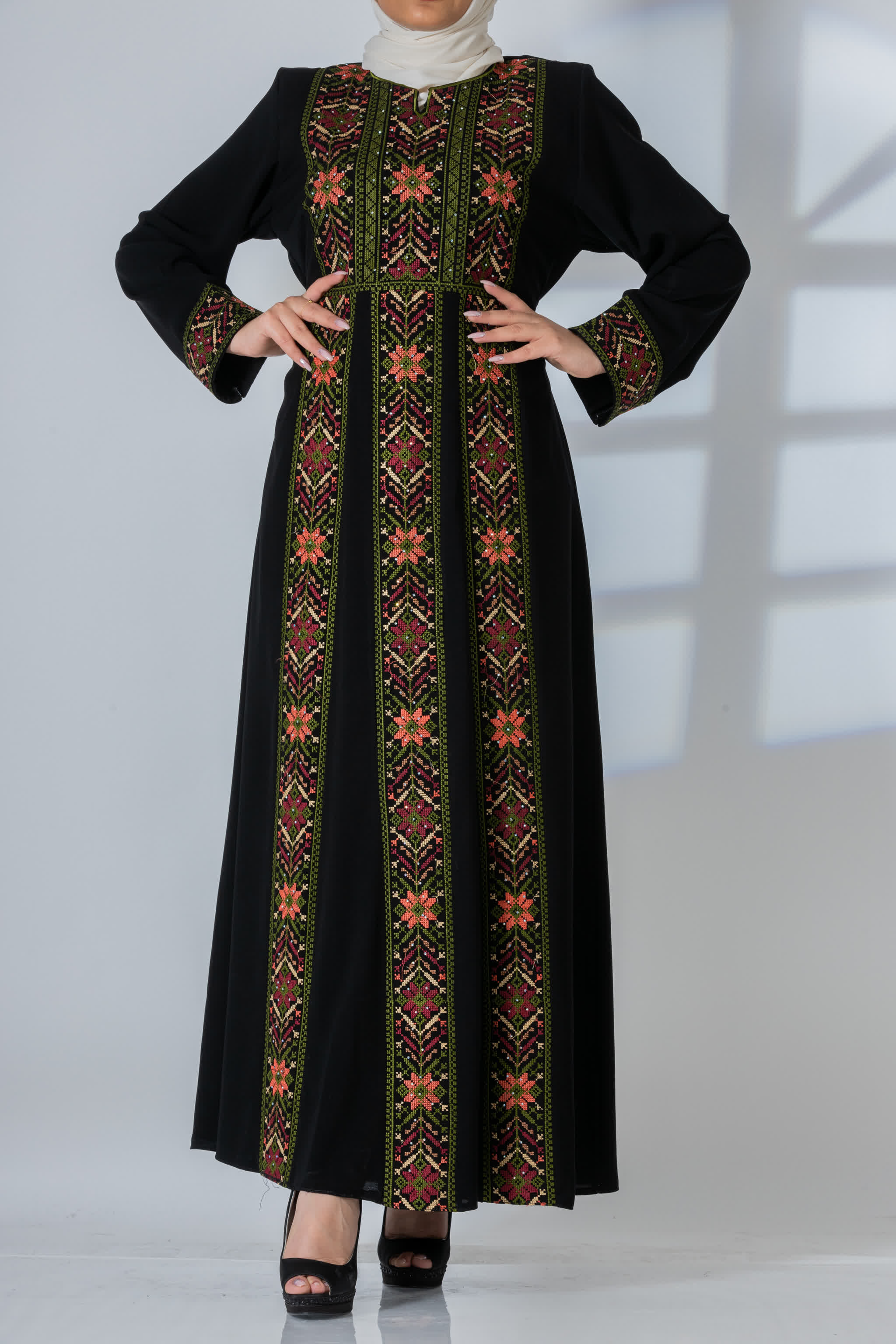 ثوب فلسطيني بتصميم ثلاثة عروق مطرزة بأجمل النقشات الفلاحية التي لا تقدم مهما طال عليها الزمن ليكون ثوب كل زمان ومكان