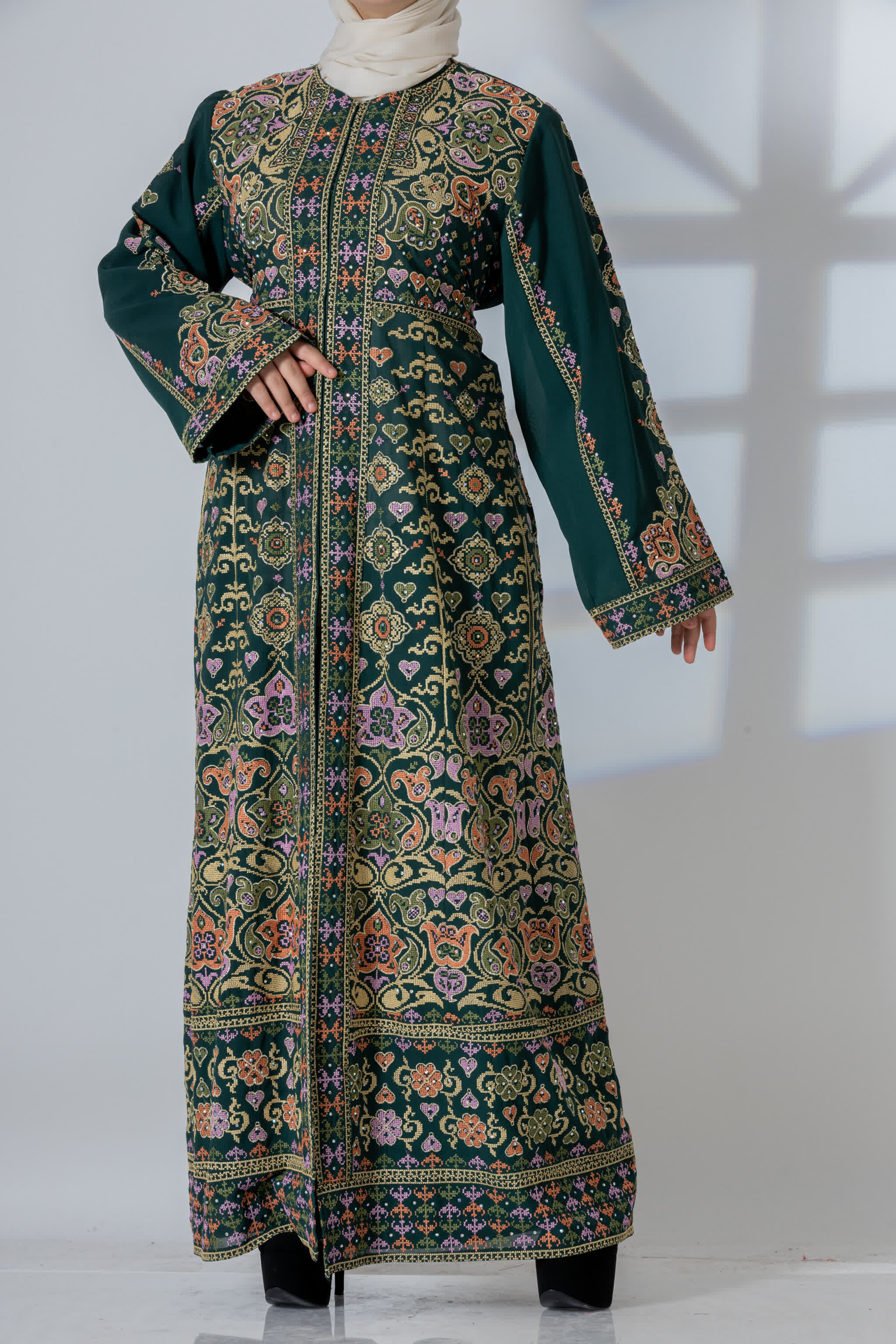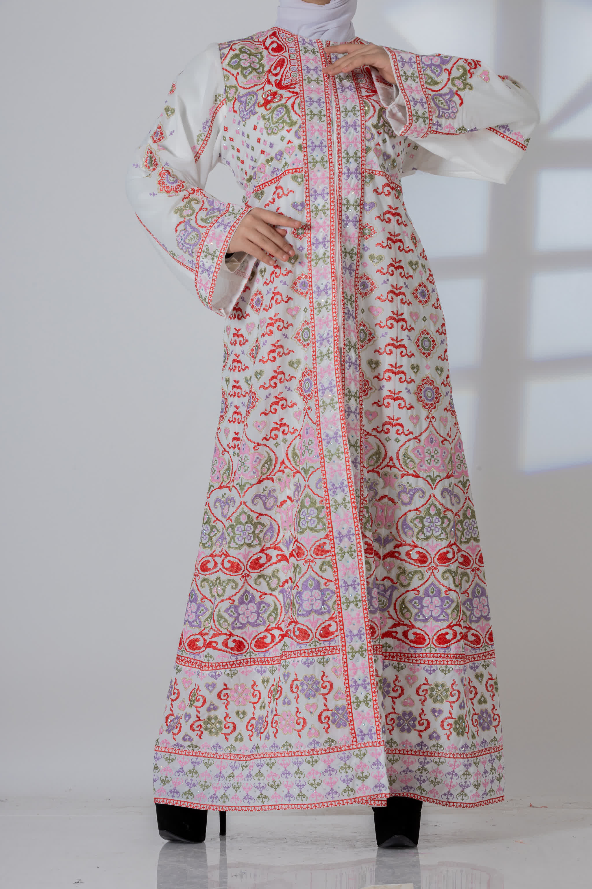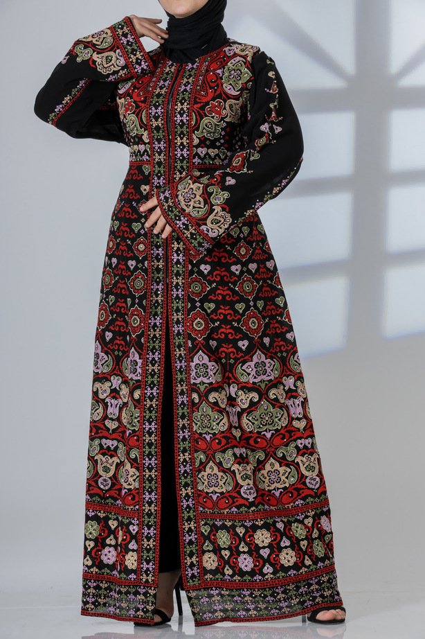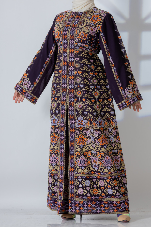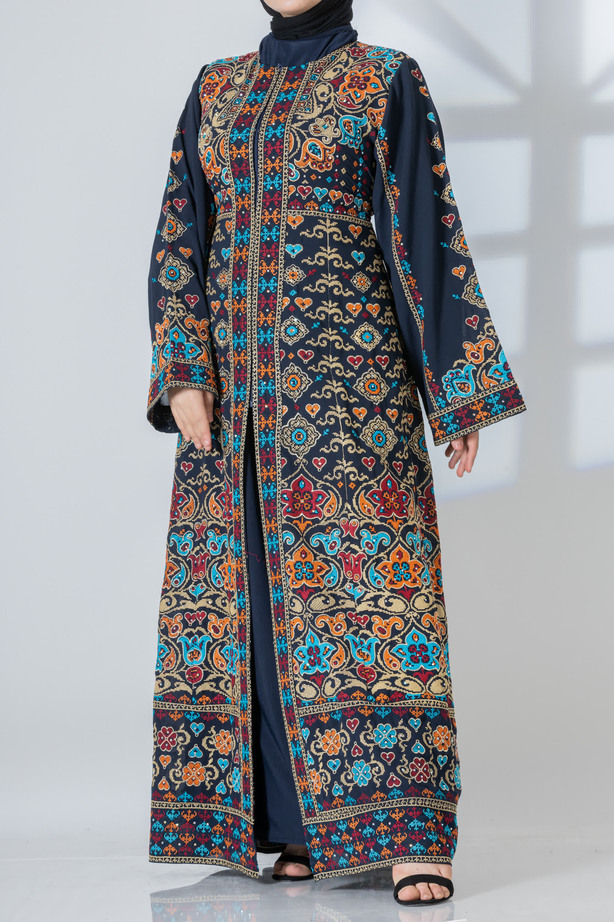 قفطان مطرز بتصميم عصري مثالي للحفلات والسهرات الليلية، يأتي بسحاب يمتد حتى منتصف القفطان من الأمام، مع بطانة داخلية