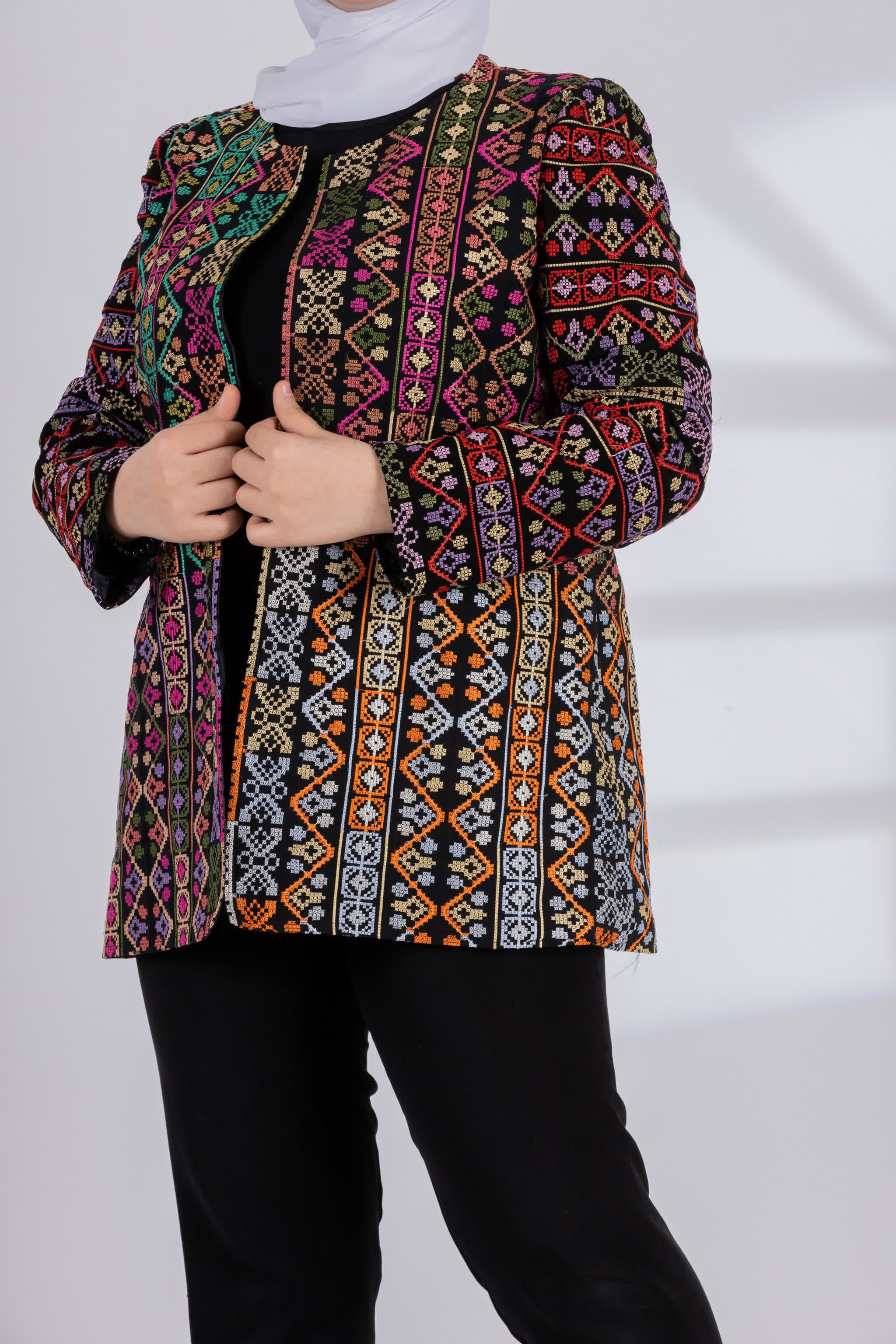 جاكيت أسيل مفتوح ومطرز بأجمل النقشات الفلسطينية على كامل الجاكيت، بألوان ربيعية مليئة بتفاصيل التراث