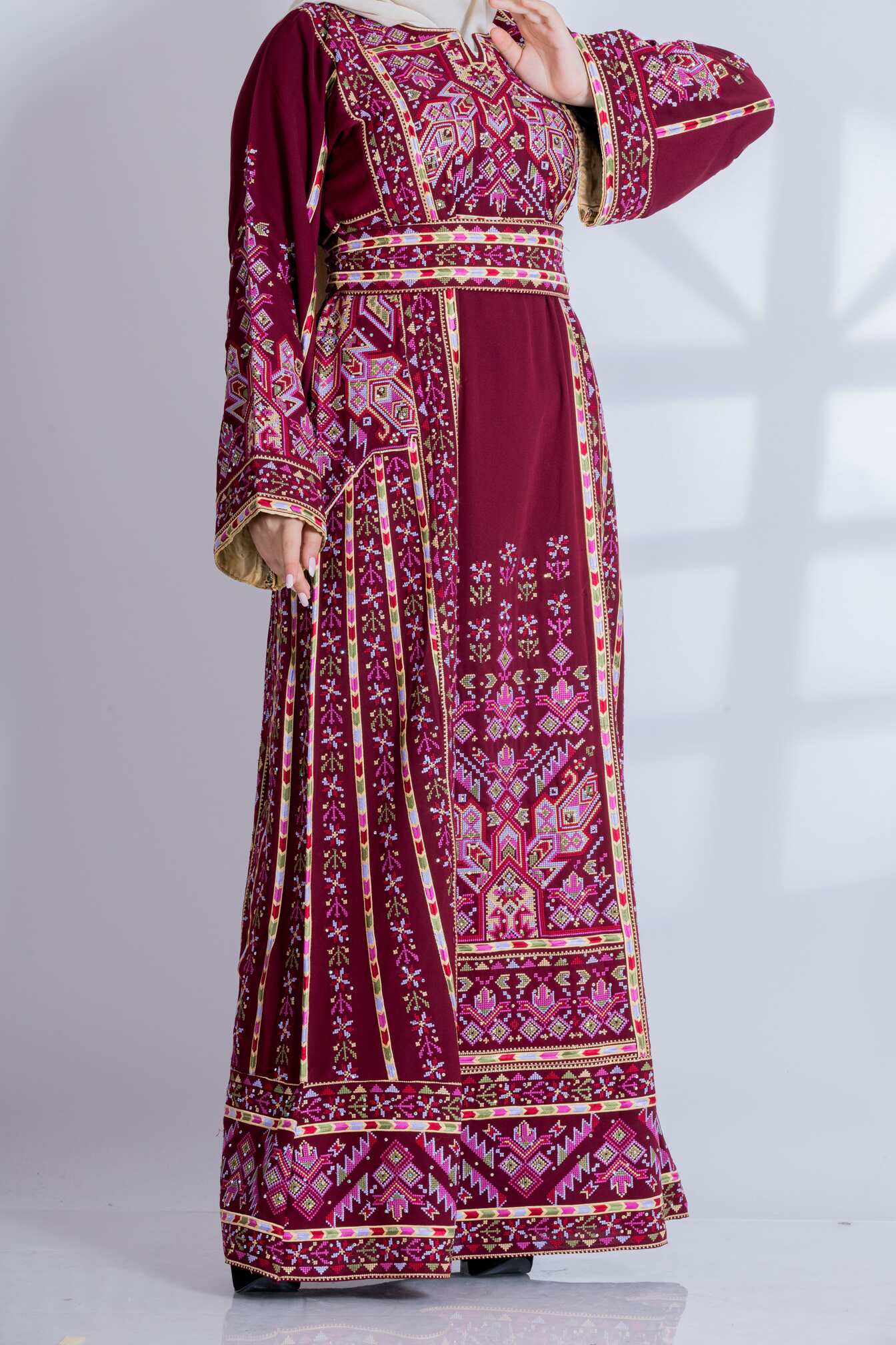 ثوب ميار المميز بتطريز فريد من نوعه على كامل الثوب بنقشات ورود وهندسية مع حزام منفصل، يتزين بخطوط مناجل على جانبي الثوب