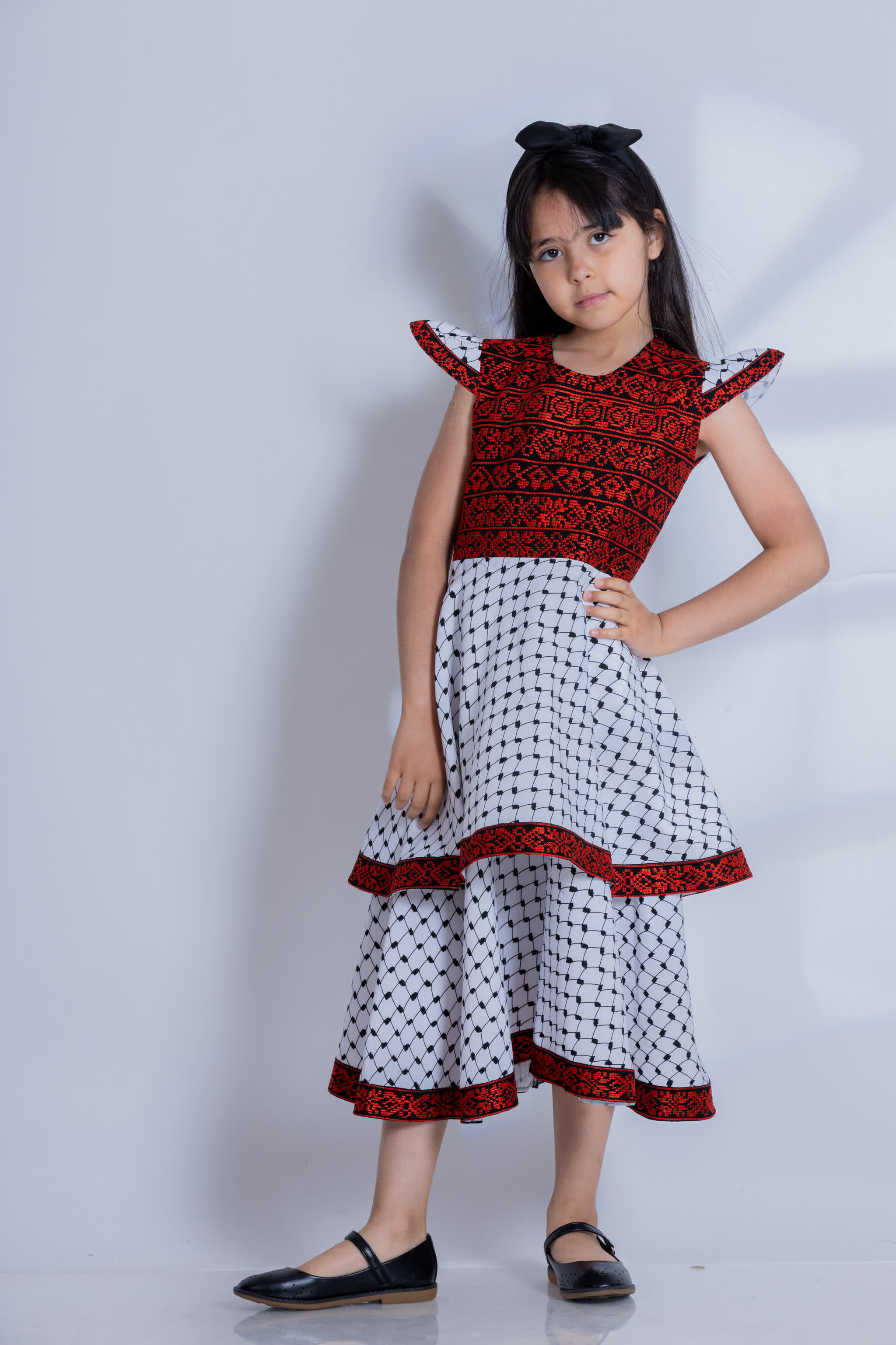 فستان الحطة الفلسطينية للبنات بطبقتين تنتهي بتطريز فلسطيني باللون الأحمر والأسود، مع تطريز مميز على منطقة الصدر