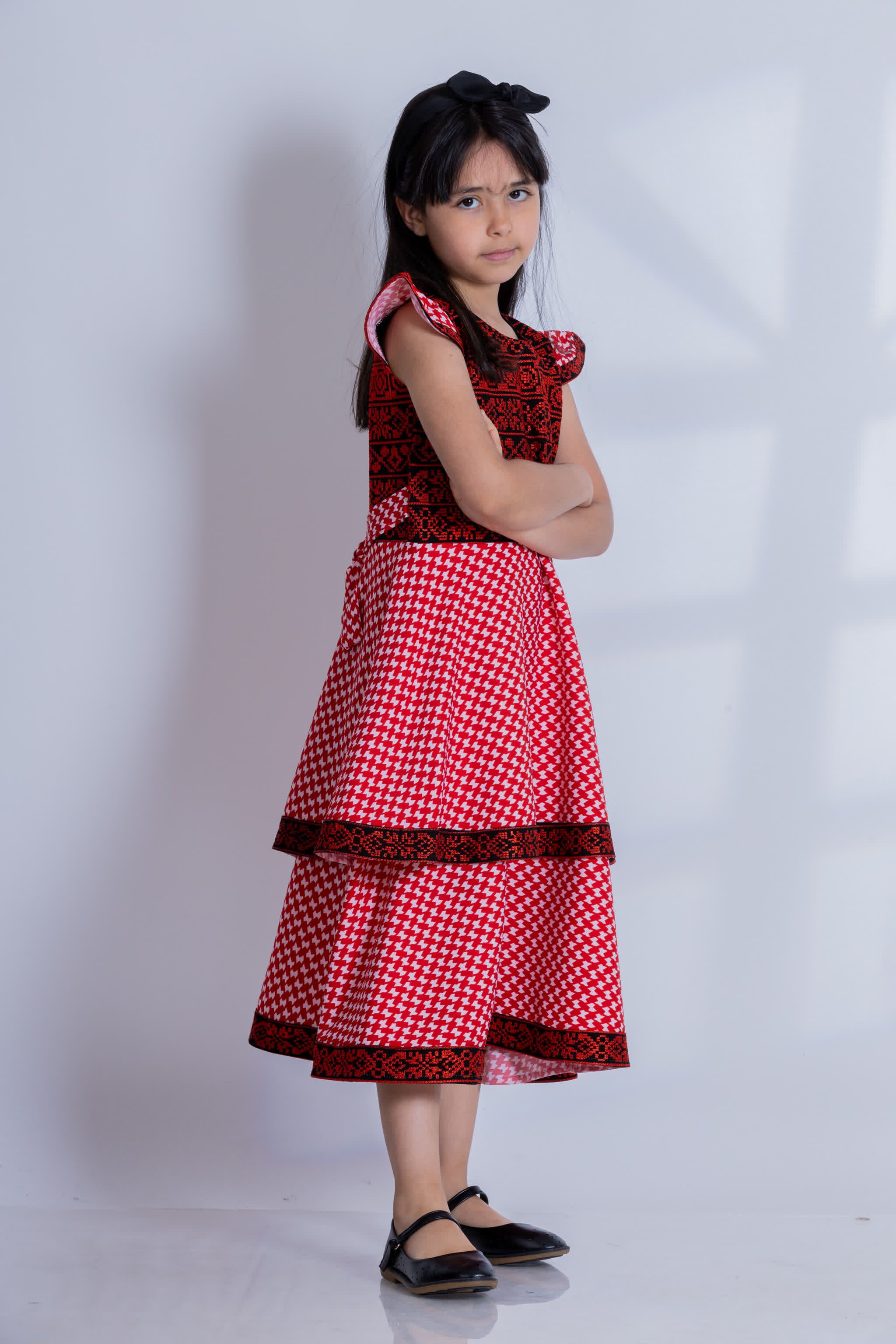 فستان الشماغ الأردني للبنات بطبقتين تنتهي بتطريز فلسطيني باللون الأحمر والأسود، مع تطريز مميز على منطقة الصدر