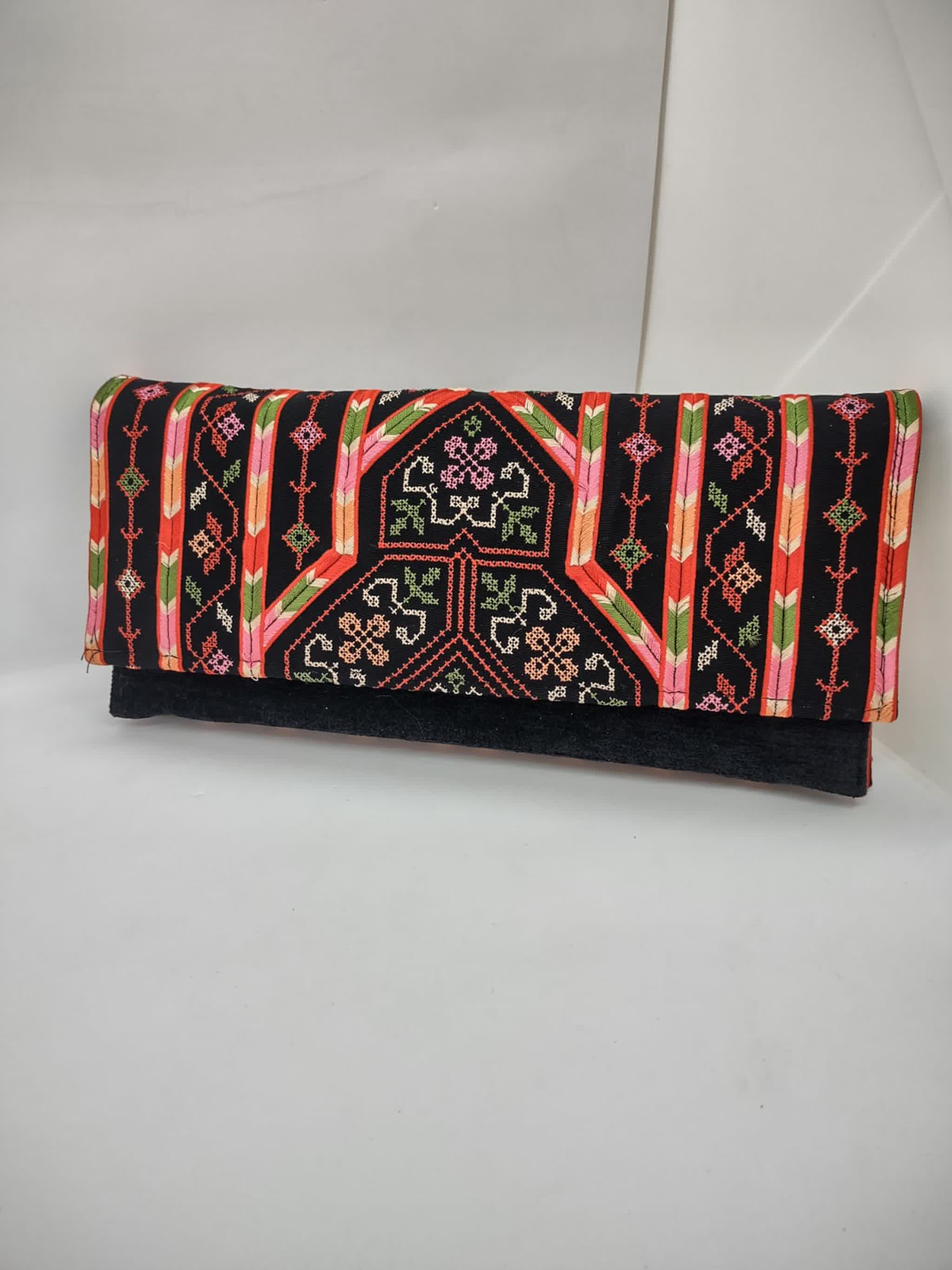 حقيبة كلاتش أنيقة مطرزة بتطريز مناجل فلسطيني بألوان جذابة، تغلق بزر مغناطيسي ومقسمة من الداخل لجيبين
