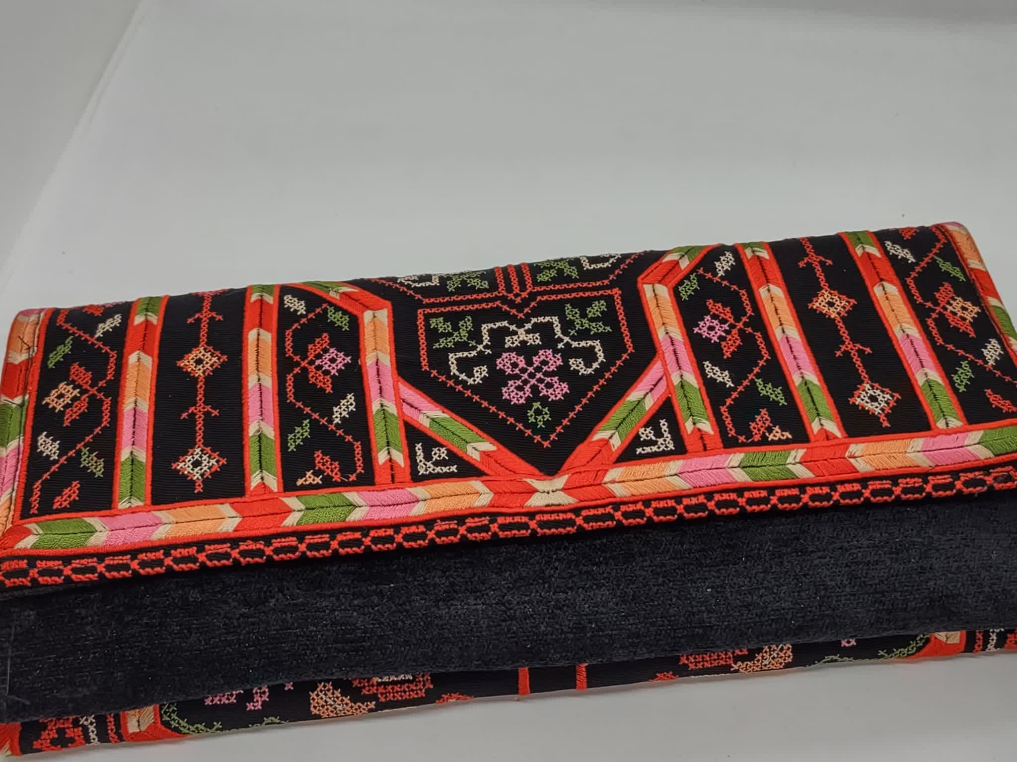 حقيبة كلاتش أنيقة مطرزة بتطريز مناجل المشهورة في فلسطين باللون الأسود والأحمر، تغلق بزر مغناطيسي ومقسمة من الداخل لجيبين