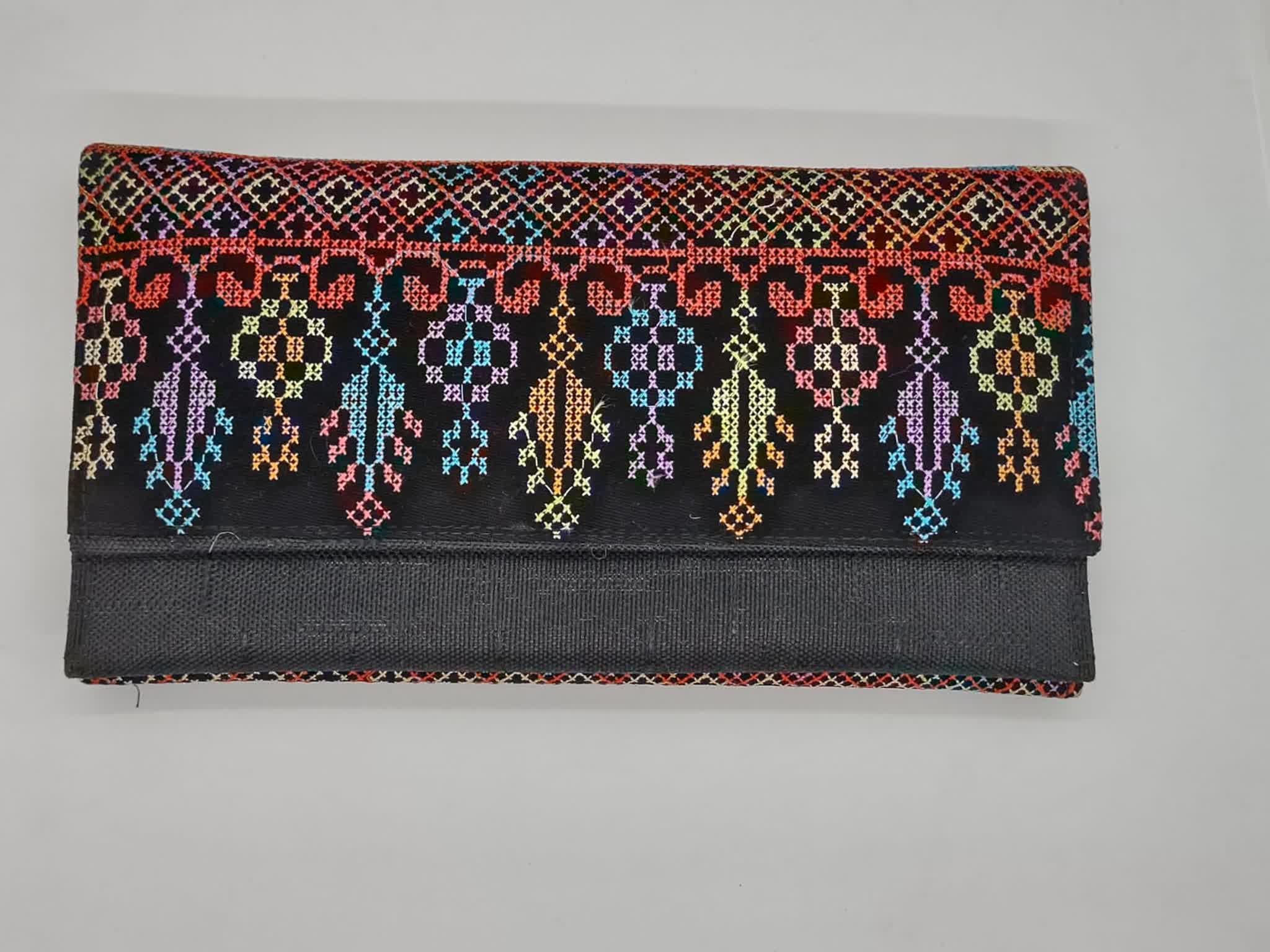 حقيبة كلاتش أنيقة مطرزة بتطريز فلسطيني بنقشة سرو ونجوم، تغلق بزر مغناطيسي ومقسمة من الداخل لجيبين